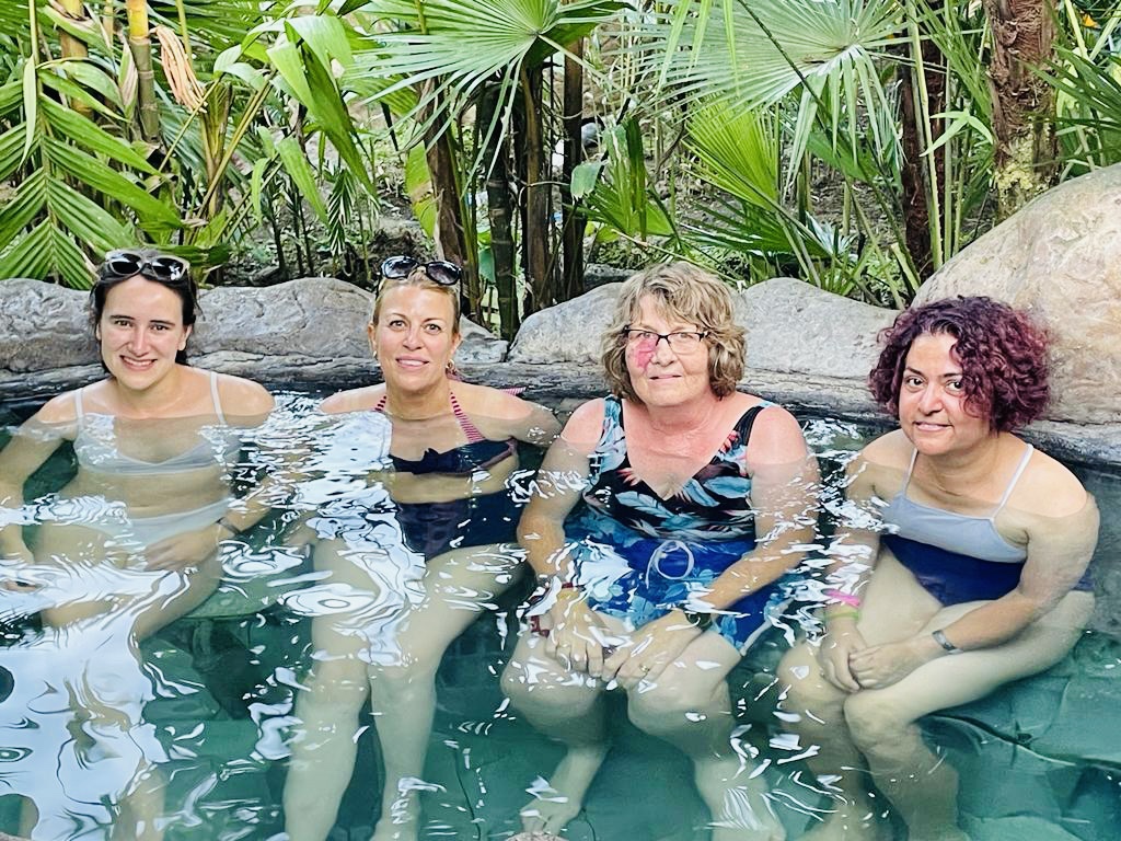 Then we went off to one of the commercial hot springs I mentioned before. For me this was a bit of a flop. It was very fake looking, very big and chock full of loud Americans! It was about 20+ small pools of water of various temperatures and you just – sat in them. It was a bit boring to be honest – I seem to have lost the ability to sit still a bit on this holiday 😂. I only have one photo and you will see by our expressions how impressed we were 😂
