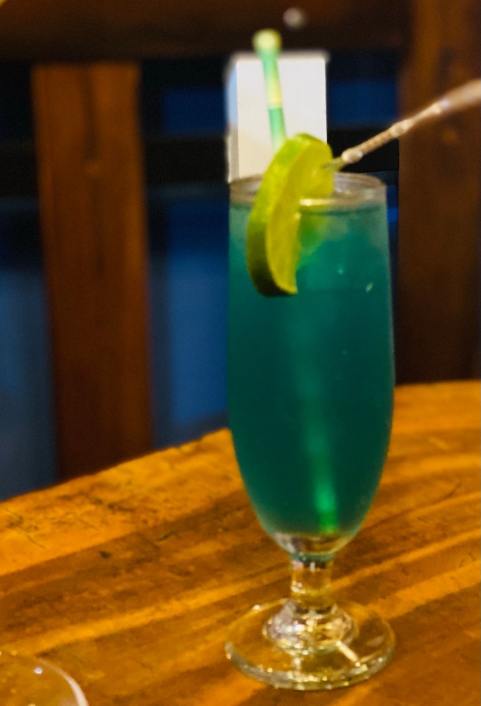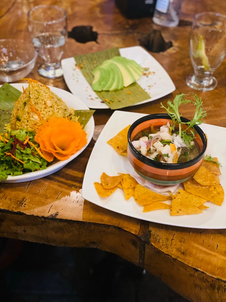 We stayed for a few hours but I was glad when half of the others decided to leave and we went straight into town, wet hair and all, and had nice meal – Katie and I shared (of course, am loving all the food sharing!) ceviche (this is everywhere, cheap and so delicious and refreshing) chicken and rice, plus plantains and avocado on the side. So good! Judy had a blue lagoon cocktail – mum, I’ve shared a picture for you as I remember how much you loved them back in the day!