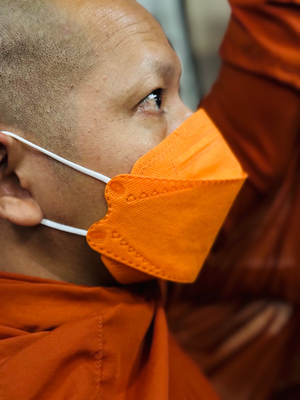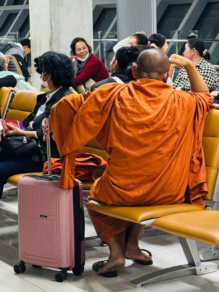 Half a dozen monks were on the 1 hour hop from Bangkok to Phnom Penh, I was very taken with the pink suitcase that one of them had chosen and even more so with the one that had gone to the sartorial effort of matching his mask to his robe – very impressive! Oddly, one of them was barefoot but the rest were wearing sandals – which made me wonder if it was God that we presumed had an objection to shoes and the others were cheating, or if it was just a predilection of this particular chap!