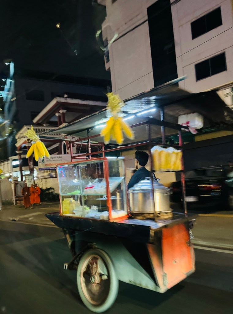 Jumped in a cab at the airport for the half hour ride to the hotel – even in the dark there was so much to see out of the window, people gathered on every corner eating street food from the cart vendors, mopeds with multiple people clinging on, tuk tuks streaming along the roads in their hundreds, skyscrapers, run down buildings and memorably a guy clearing his shop front for the night and carrying in a rack of around 30 Mrs Santa outfits!