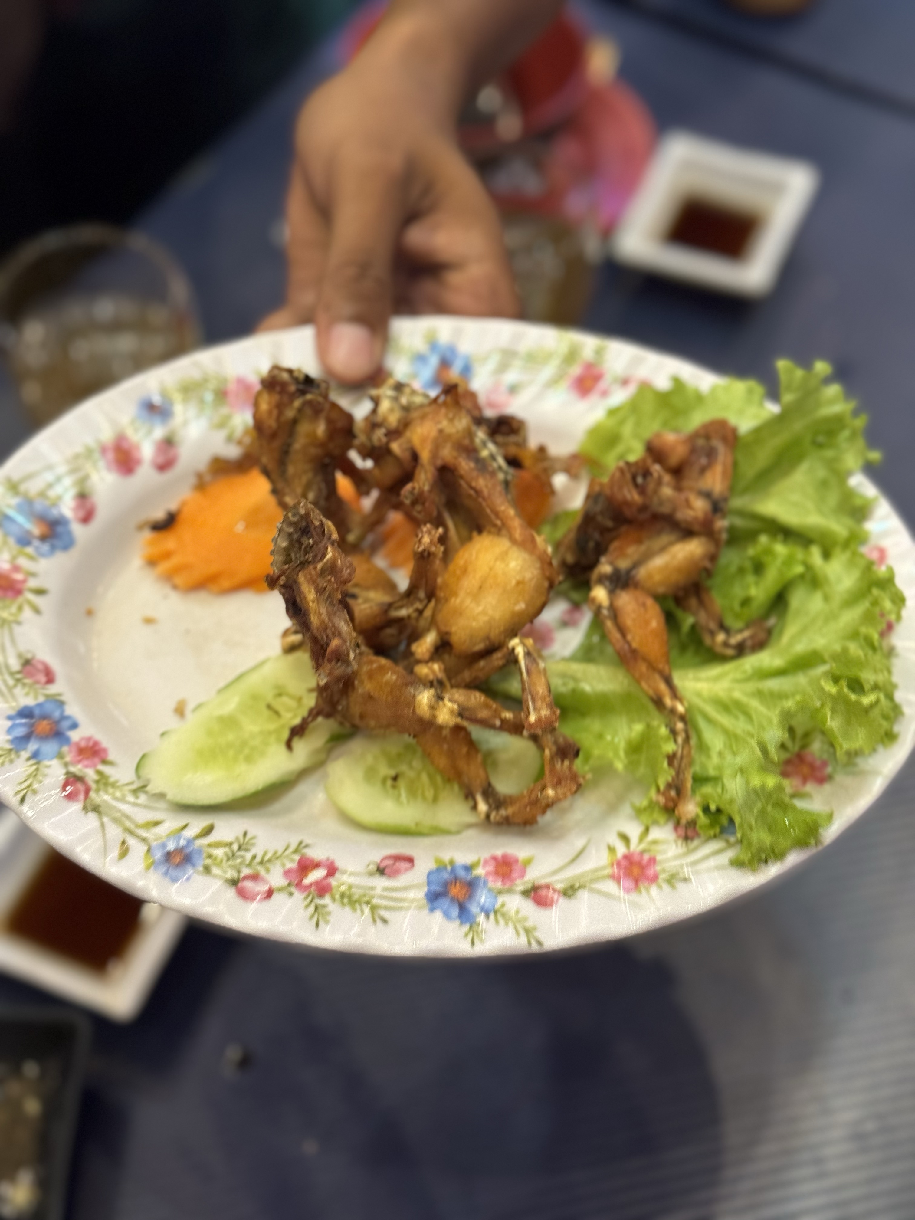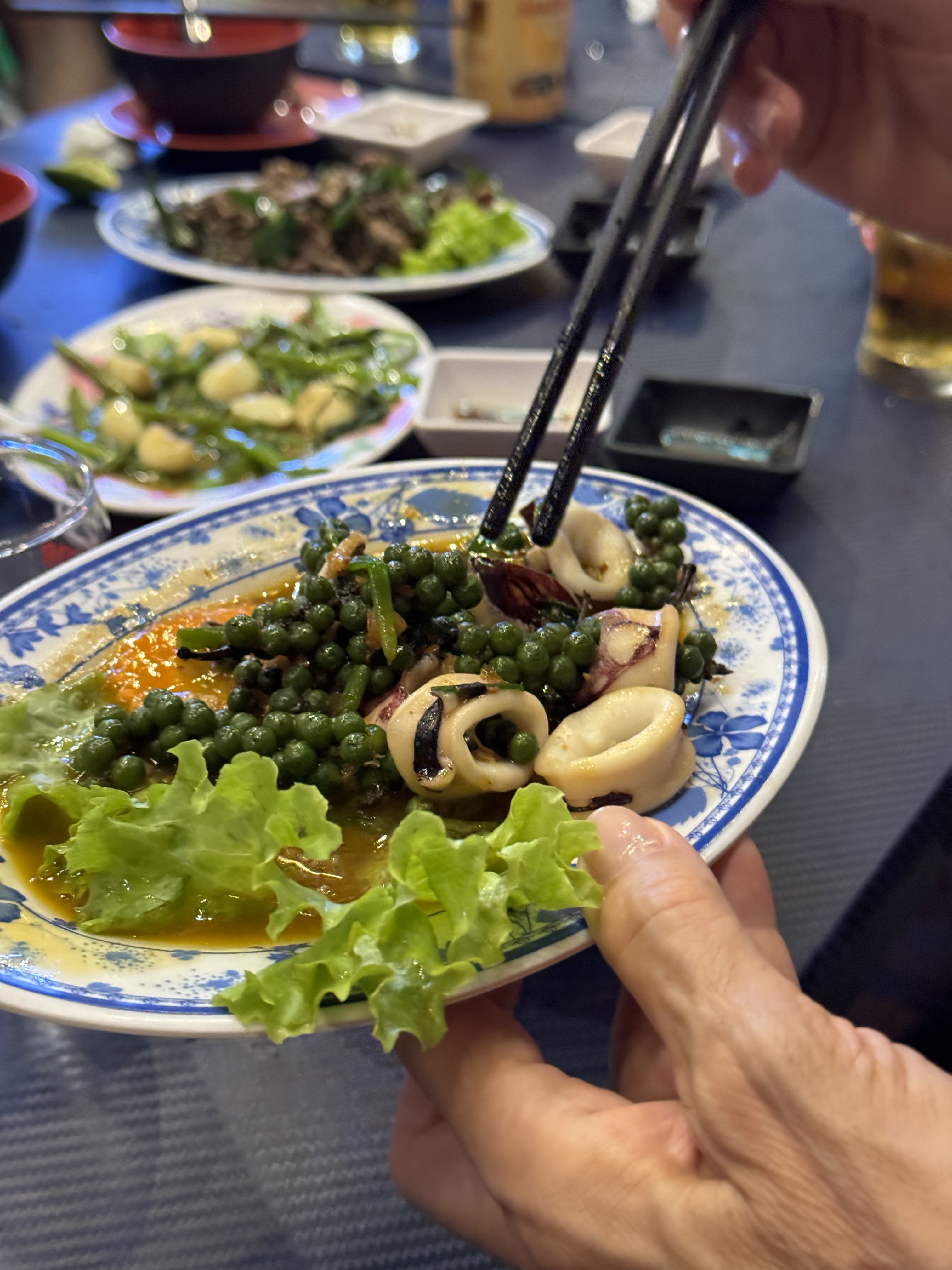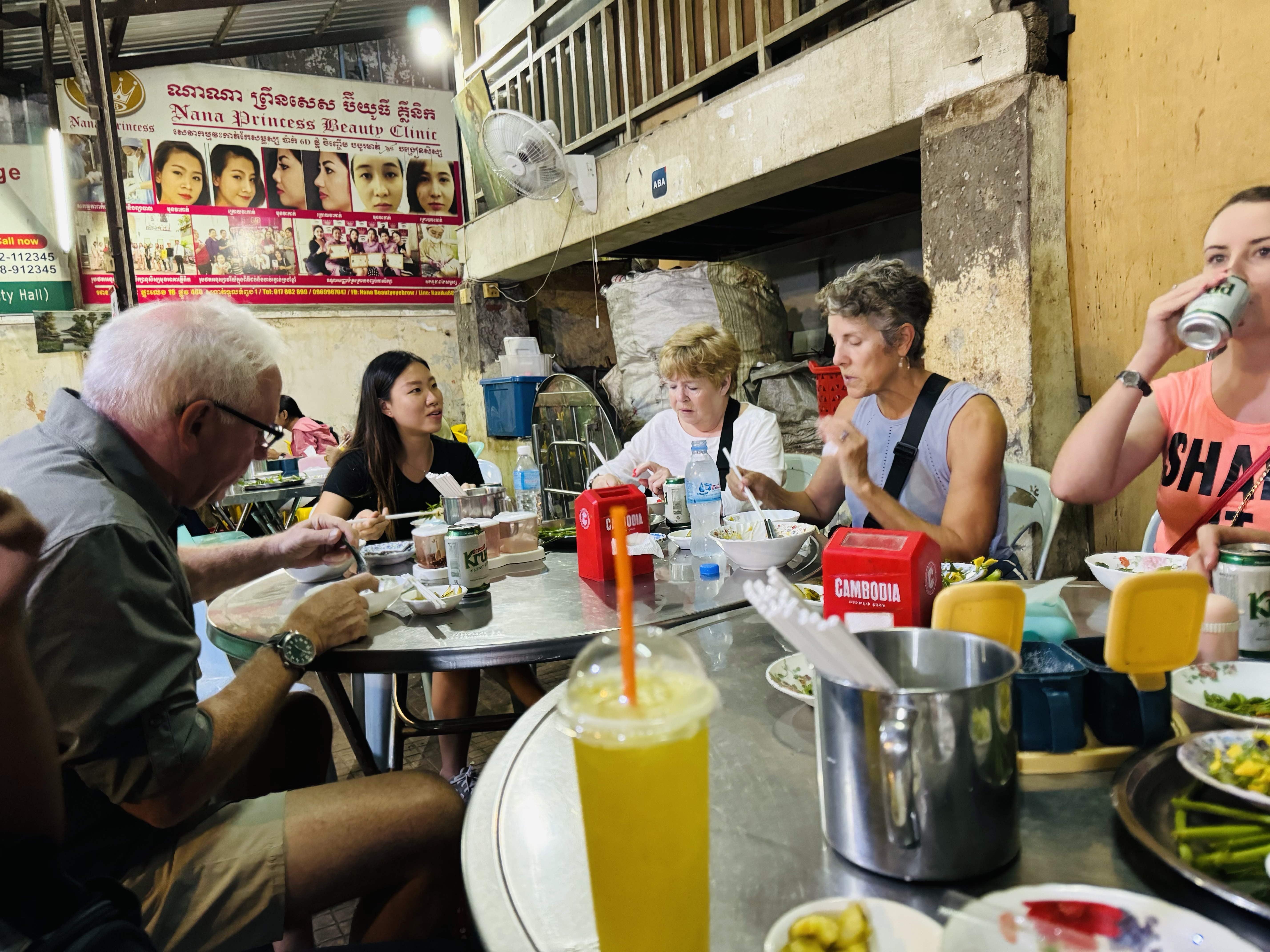 Food included – fish amok, like a yellow fish curry with potatoes, morning glory with garlic, grilled squid with kampot peppercorns, beef lok lak (like a beef stir fry with a fried egg on top), chicken and pineapple, rice – and then the stars of the show – frogs legs and beef with red ants! Yes, really. Frogs legs taste like bony chicken and I didn’t think you could taste the ants in the beef although the others insisted you could – in fairness, I very rarely eat beef so I don’t have much to compare it to, but my taste buds could not differentiate the anty extras!