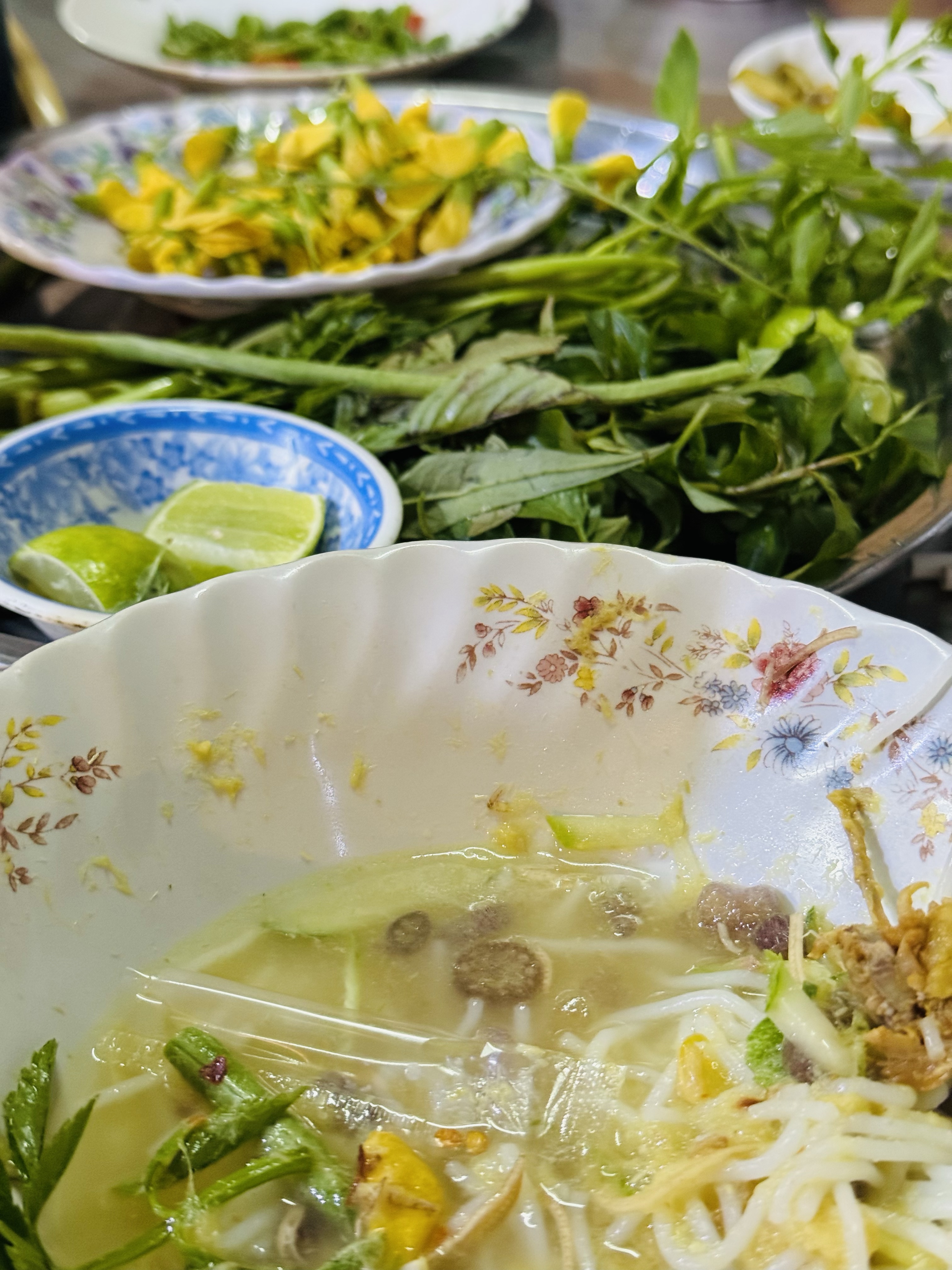 We got to our first stop, a large, very – functional – space and sat down to try our first 2 dishes – fish and lemongrass soup with lily root (known as Grandmother’s favourite) and a coconut based soup with chicken and a kind of black pudding, both with rice noodles (mum, seems like absolutely everything here is made with rice flour, you’d be in heaven!) Lots of fresh herbs on the table to add to the soup as well as all the chilli oils, soy sauce, sugar etc that are everywhere for you to tweak your dish to your own particular requirements.