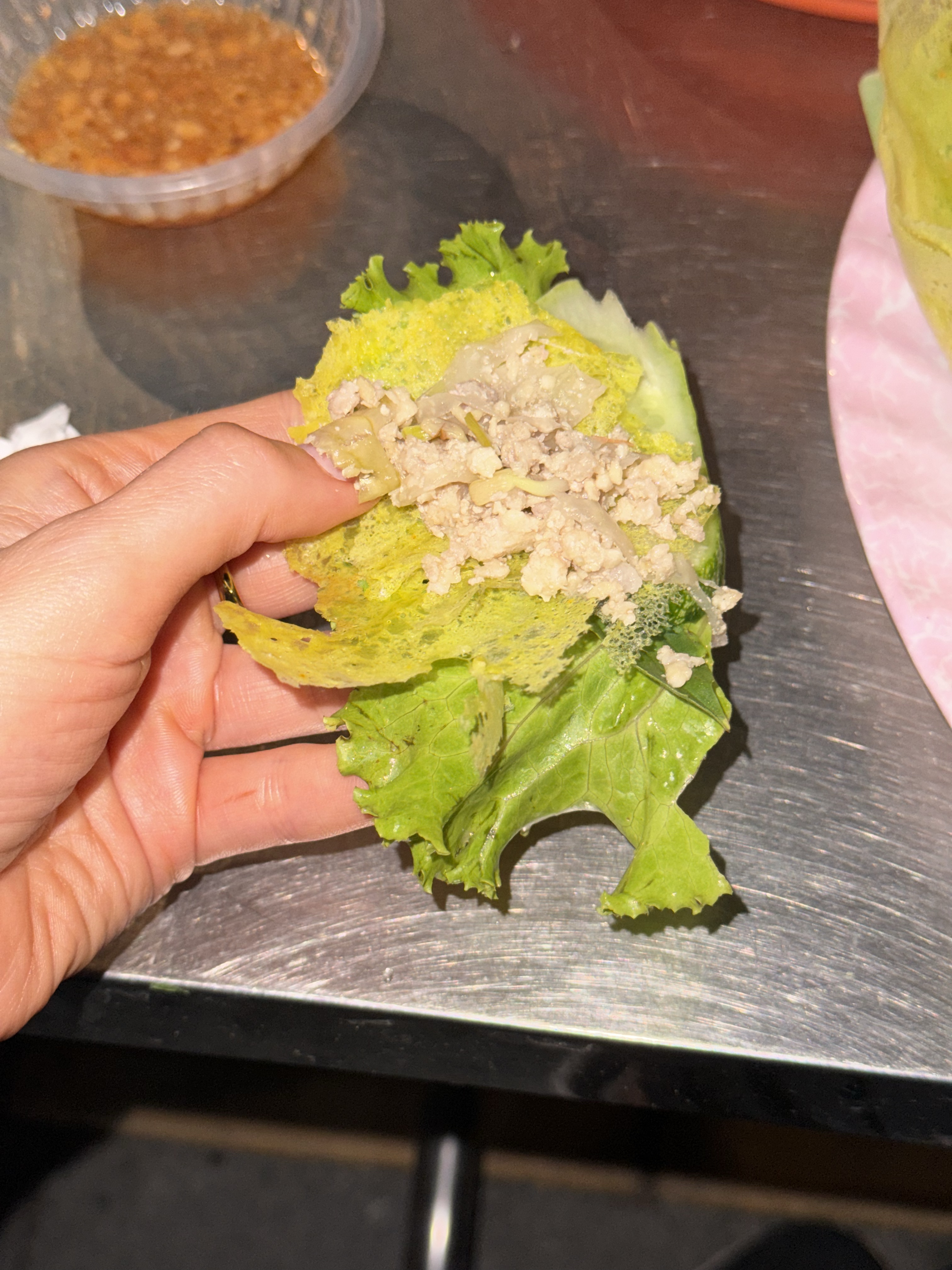 Off in our carriages again for stop 2 – this one to a stall on the street with miniature chairs that looked like they were for nursery school children (these are everywhere, what does Asia have against full sized chairs…?!) Here we had deep fried rice flour balls with spring onion dipped in a sweet and sour coconut sauce – pretty good, bit oily maybe, and a pancake made from rice flour, egg and turmeric with a filling of chicken mince and onion. For this you got a lettuce leaf, put some cucumber and fresh herbs in, tore the pancake open and added some of the wrapper and the chicken, rolled it into a little tube and dipped it in peanut sauce. Wasn’t bad at all but nothing to go crazy about and go over the 2 bites!