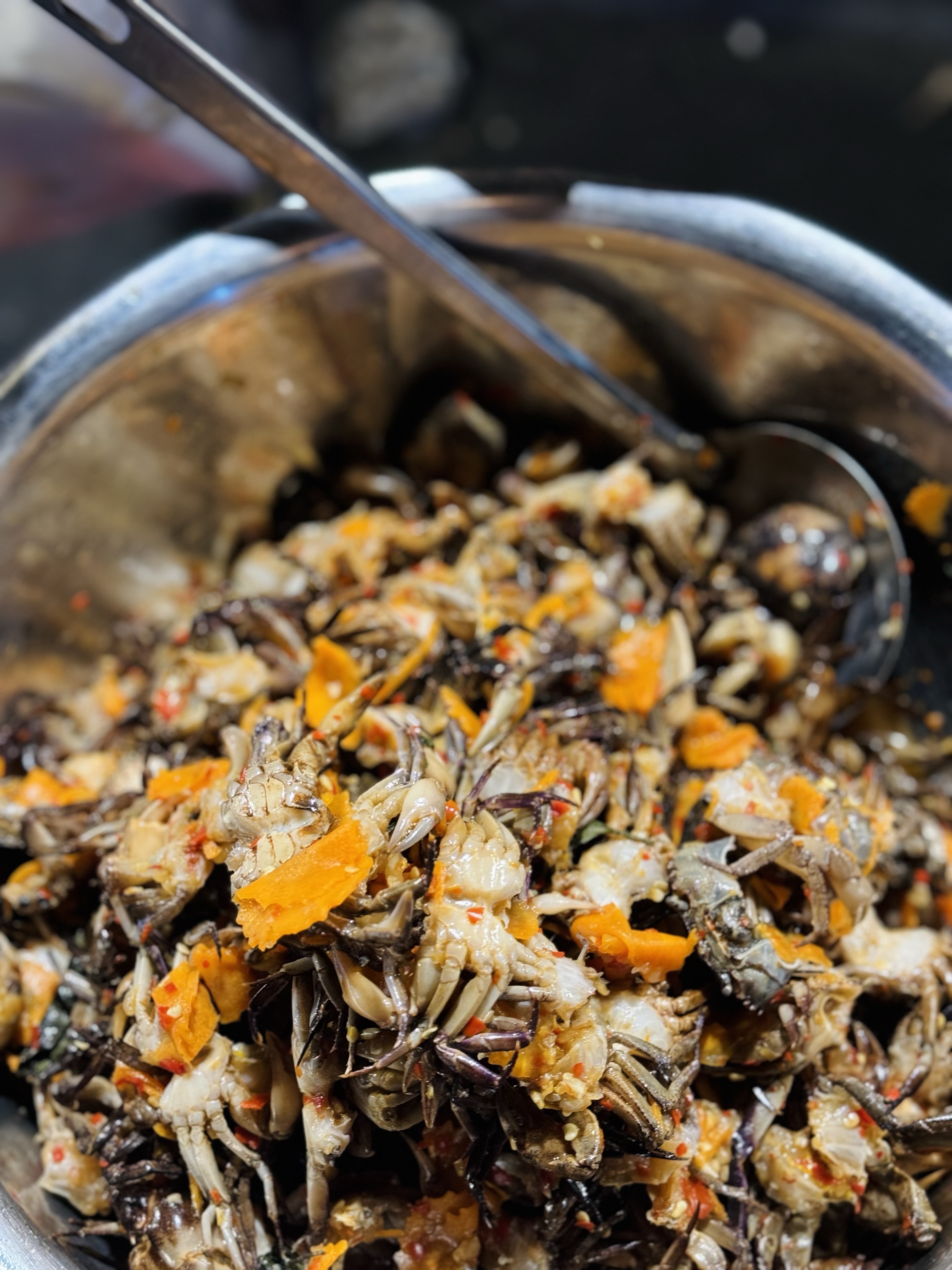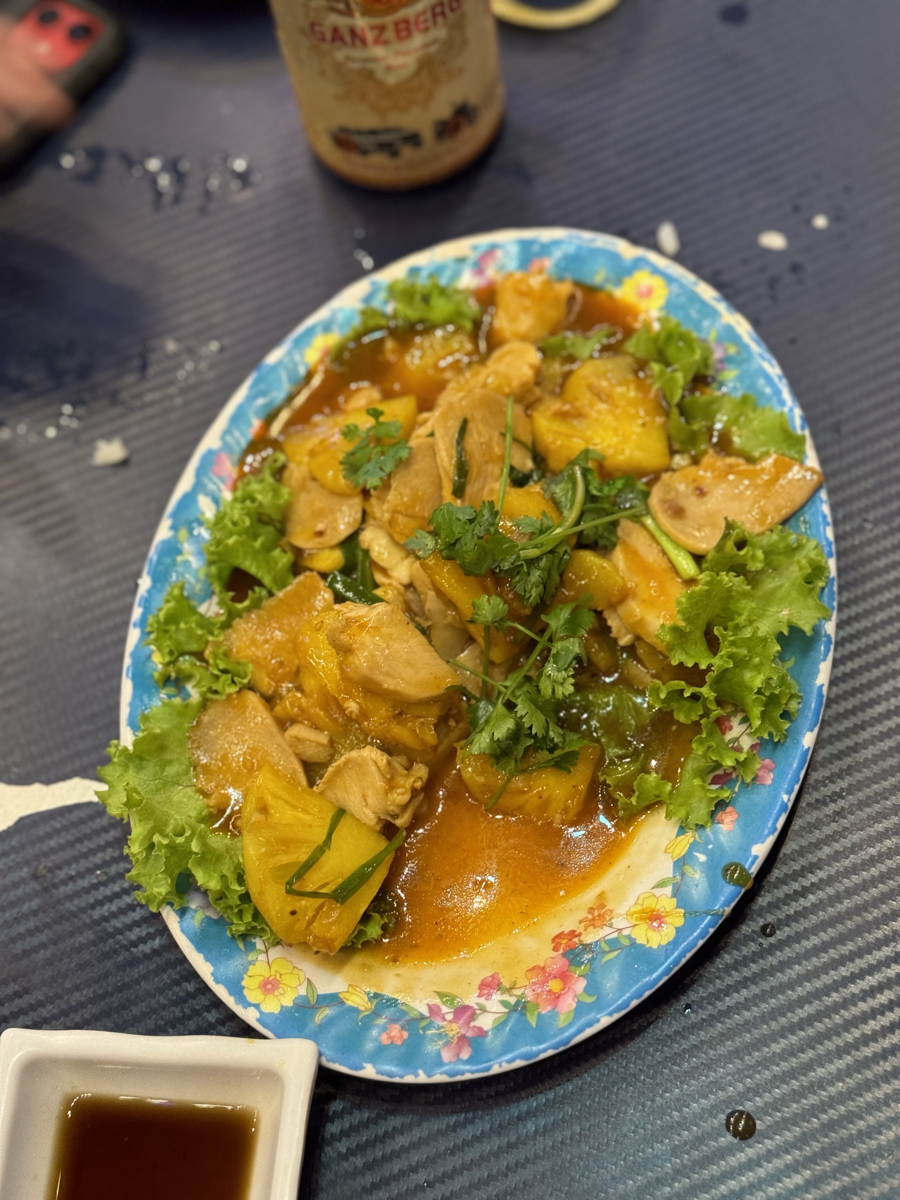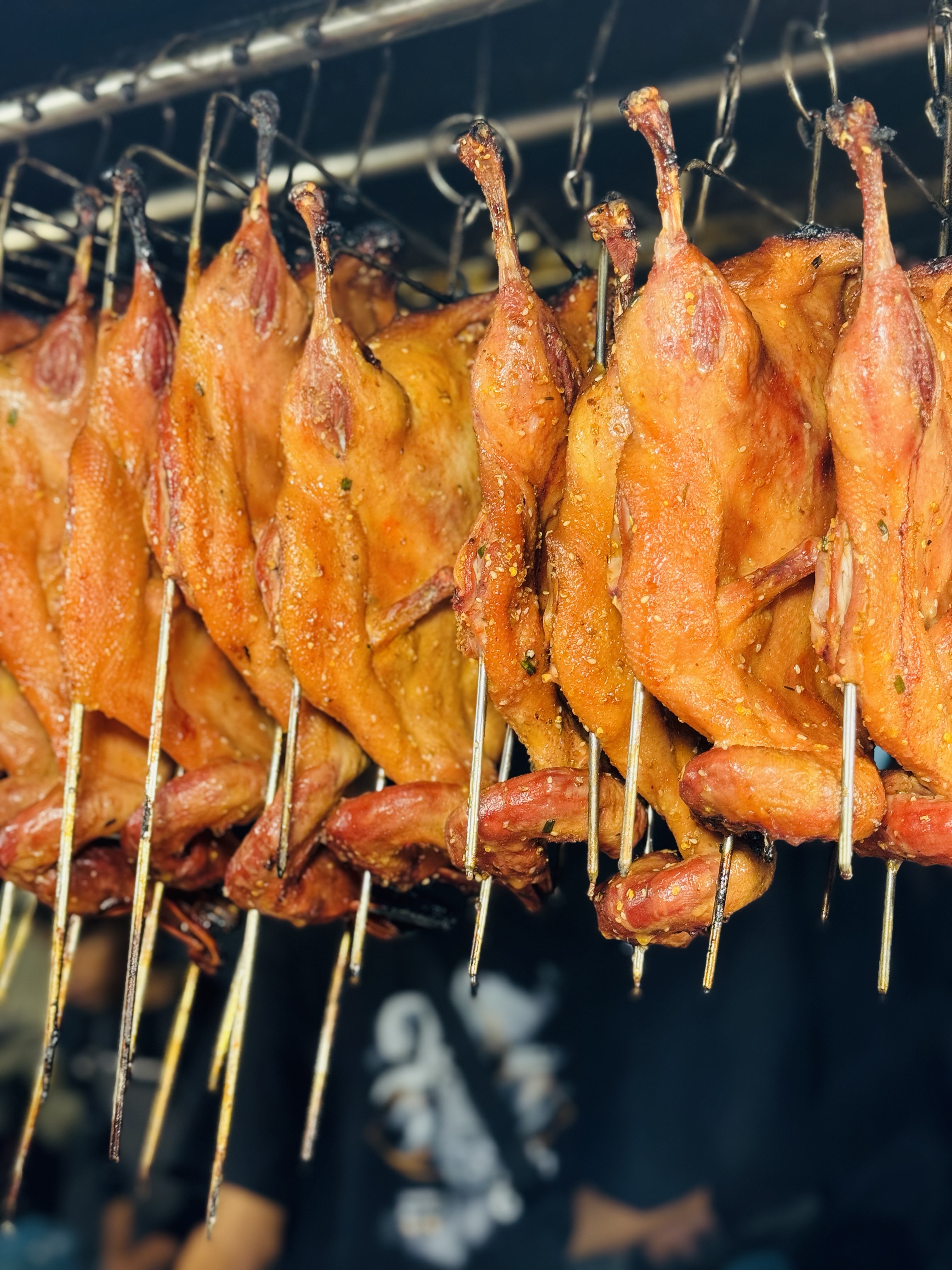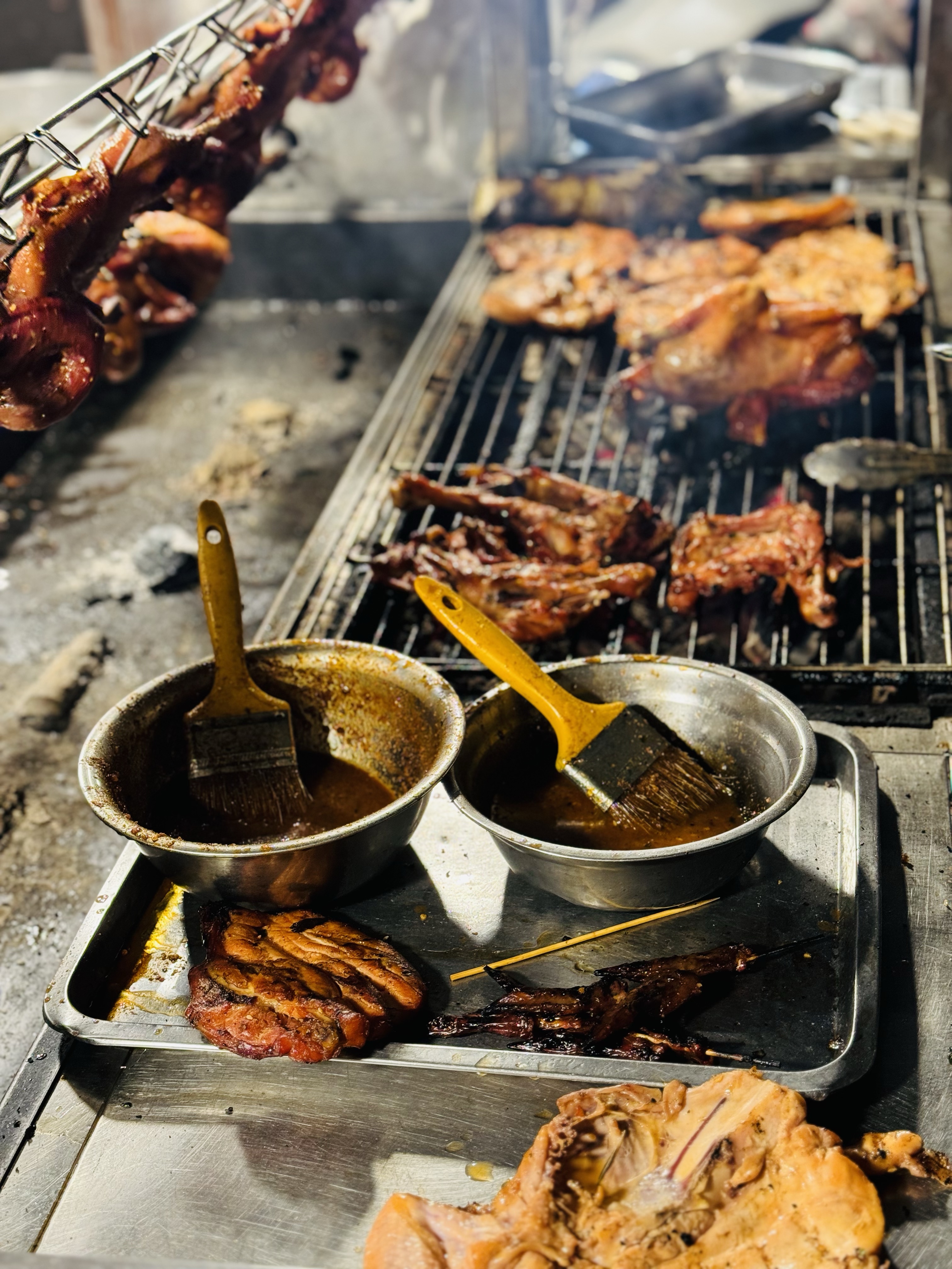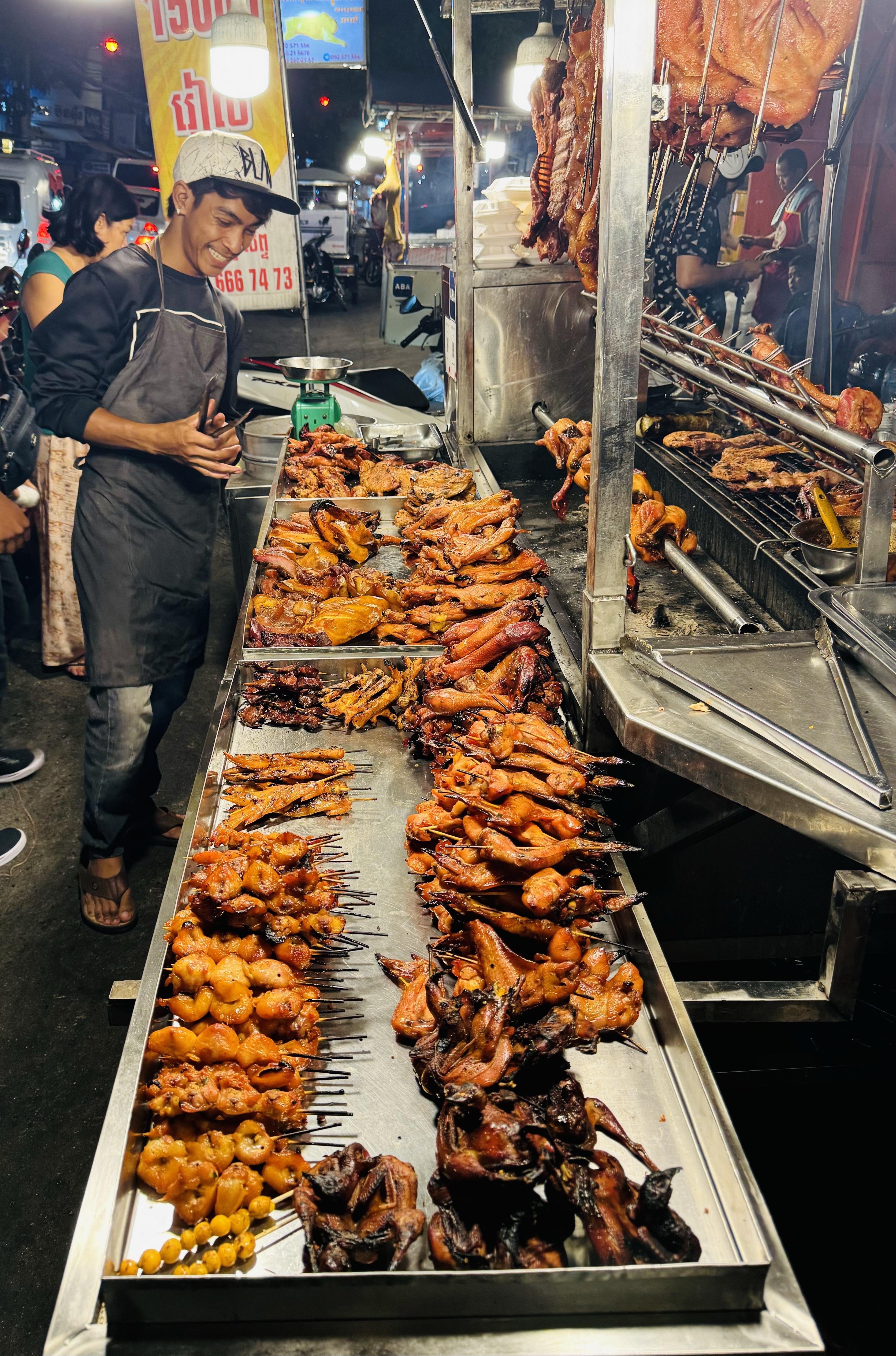 Then we went to a bbq stall run by three young blokes – apparently they are very big with You Tubers and Tik Tokers – I really wasn’t expecting to have you tube and tik tok talked about so much here, shows how much I know! They were grilling every type of meat you can imagine, painting on their special marinade with a paintbrush of the like you’d use for slapping on a bit of emulsion! We tried some bbq pork rib – ribs aren’t really my thing, too much bone, and some grilled chicken which was really juicy and tender. I just had the chicken breast though, not the other more unusual parts of the bird you can see in the pictures!