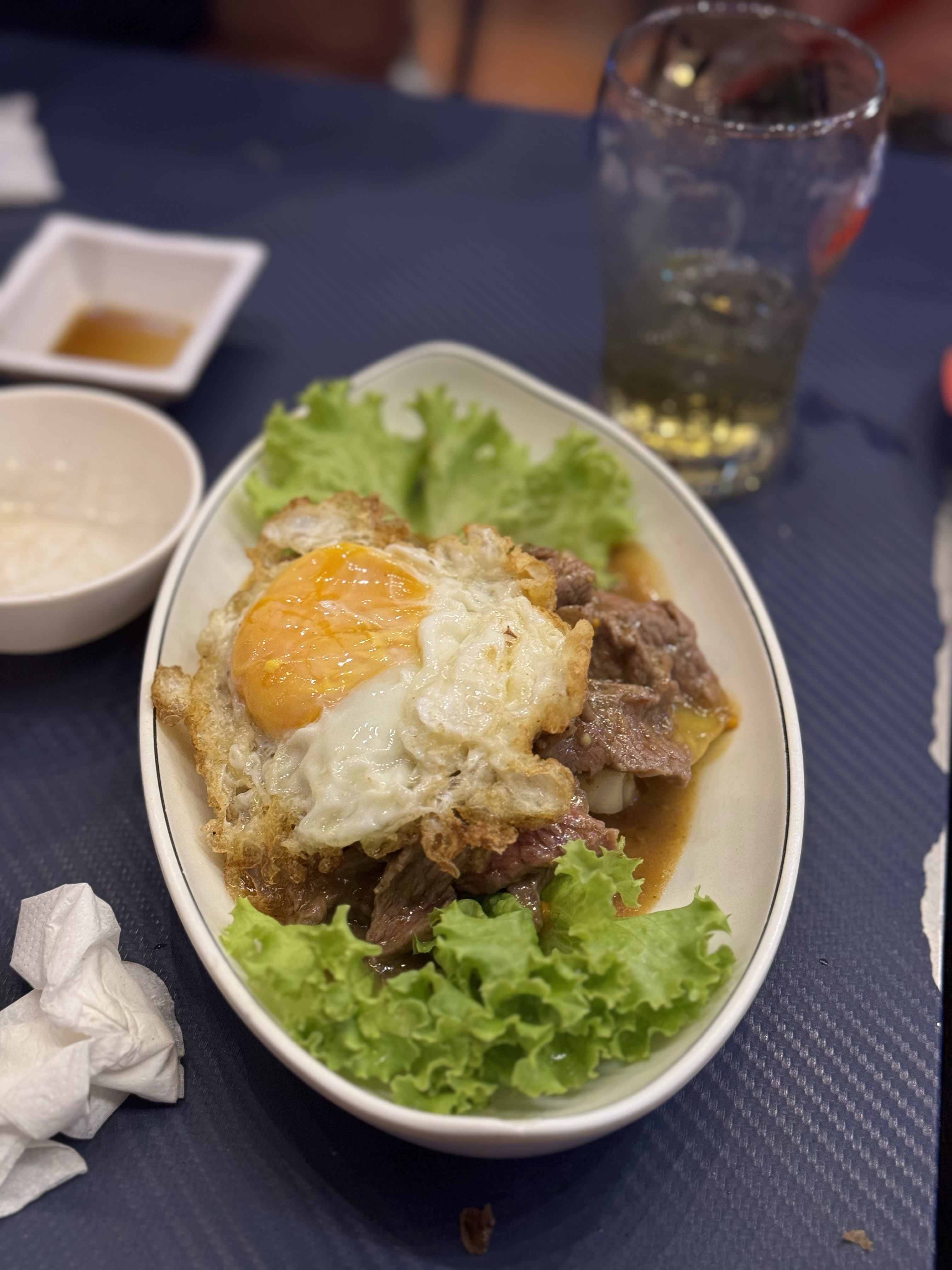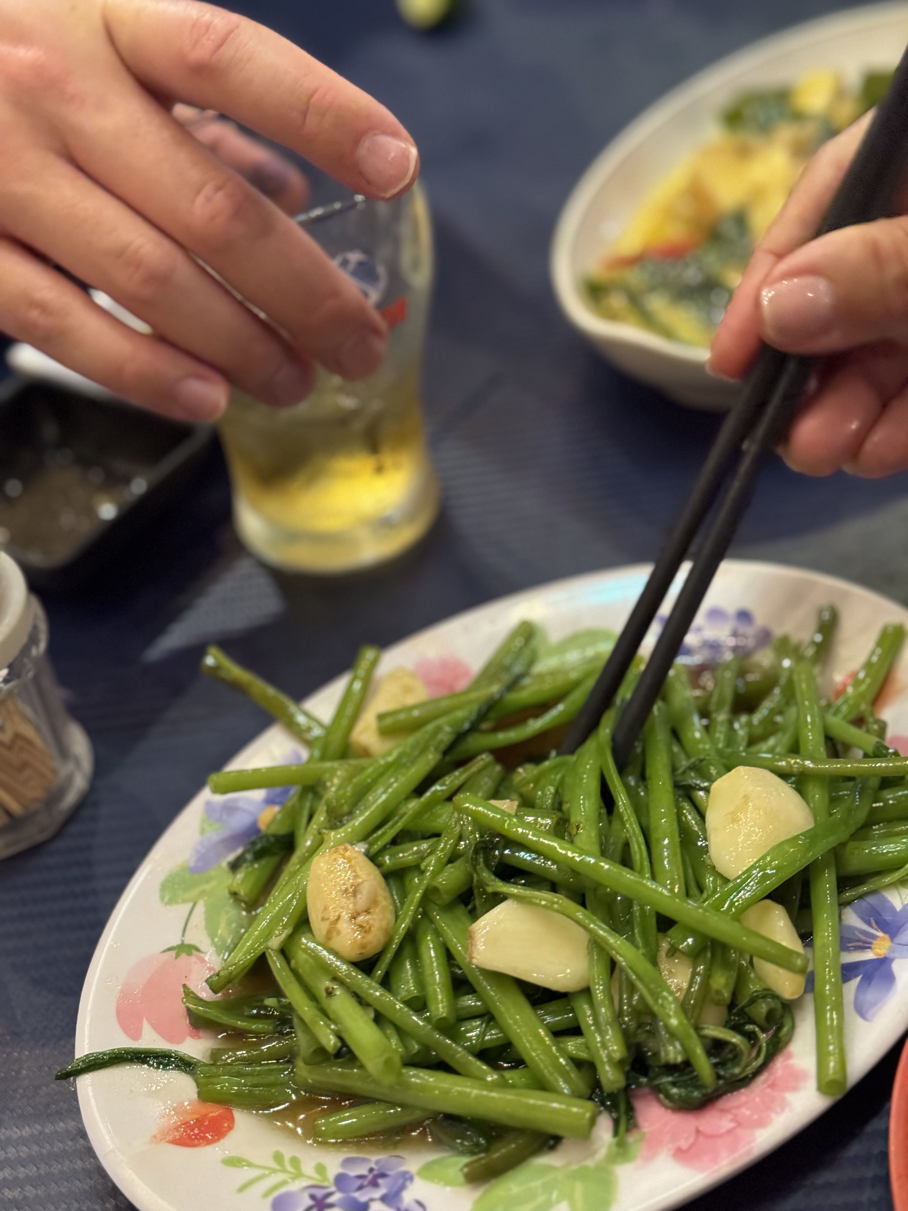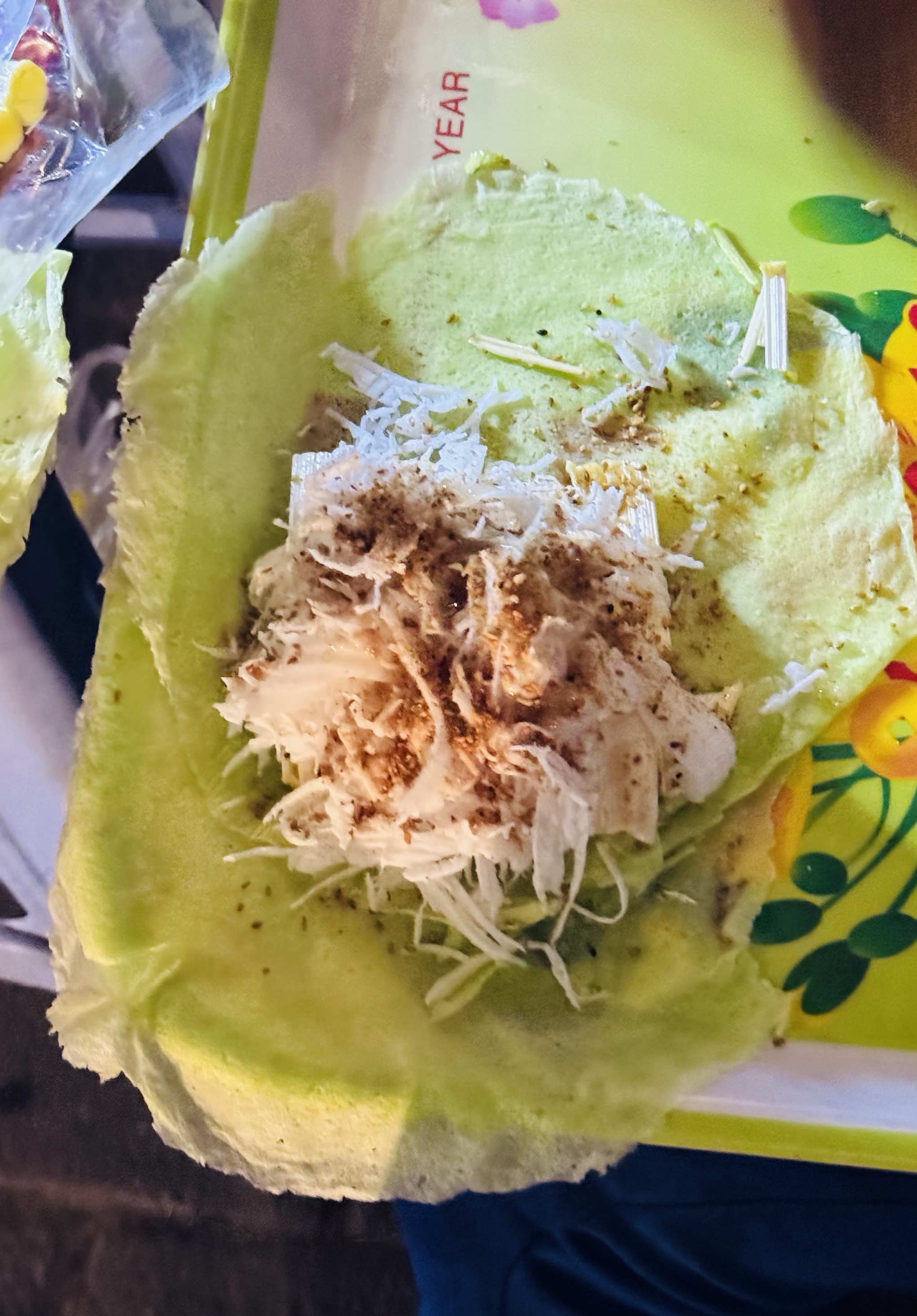 Now I do not have a good history with SE Asian desserts, they are normally very gelatinous and luridly coloured – however, my luck changed! This was so delicious. It was a pancake made with pandan, filled with shredded fresh coconut, a drizzle of condensed milk, dried crunchy sugarcane and sesame seeds. It was so good! Crispy, crunchy, sweet. I broke my own rule and ate the lot and paid the price by feeling quite sick but it was totally worth it! Apparently they’ve been there for decades making the same thing and it’s famous, we were assured people rolled up in Bentleys and Rolls Royces to get them!