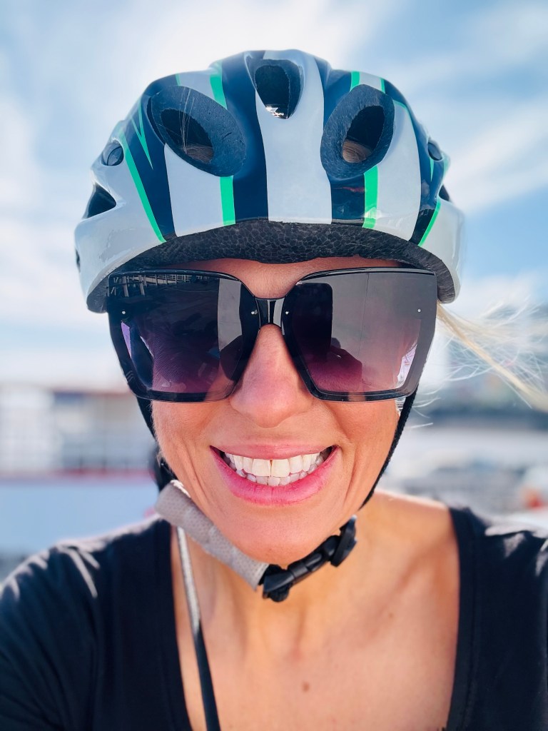 We got fitted for our bikes and helmets and then it was announced we had to cycle to the ferry – down a super busy main road. I was expecting all cycling to be done on sleepy little country roads so this was a bit of a shock! It only took about 2 minutes but it seemed like forever.