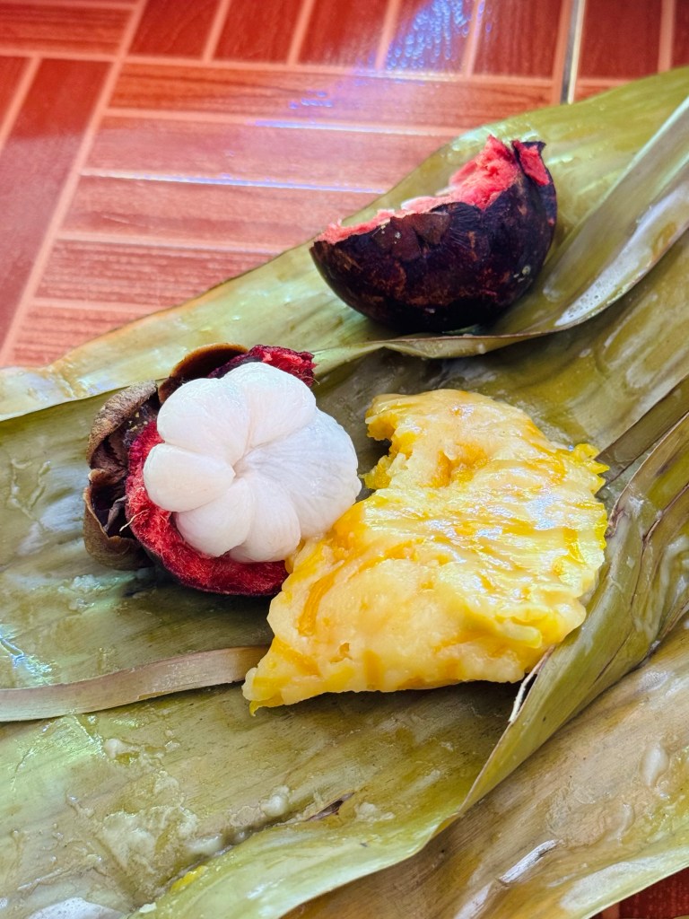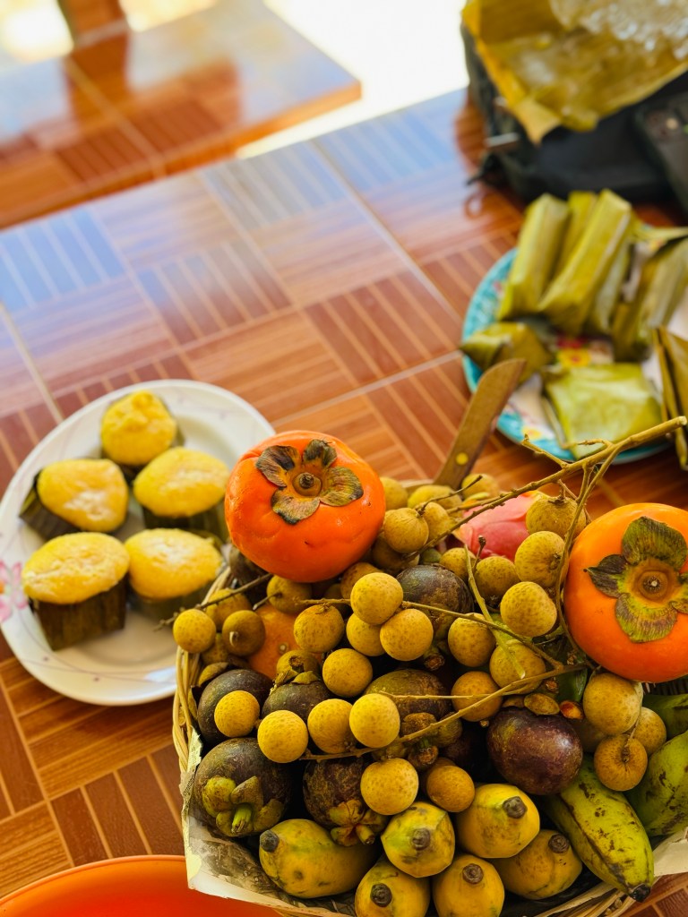After a while of riding we pulled into the front yard of a large house – all the houses out in the country are built up on stilts so they they can work underneath – this family ran a small silk weaving workshop with everything made by hand. It looked so laborious and very manual – a week to make a sarong! They served us some snacks which was excellent as I hadn’t had time for breakfast as the pick up had been early to arrive. There was lots of fruit – best were the mangosteens (the deep red skins with segmented white insides in the photo) and longans (the smallish round yellow fruits) which are like extra sweet lychees. Then there were the sweet snacks and again very surprisingly I actually liked them all! They were all based on sticky rice, some ground into a paste and some whole rice, mixed variously with pumpkin (the best), jackfruit, coconut and banana and steamed in banana leaves. Then there were palm cakes (the round ones) which were made from some derivative of the palm tree – I could not understand the explanation of this and there’s only so many times you can ask so we’ll all have to live in ignorance I’m afraid!
