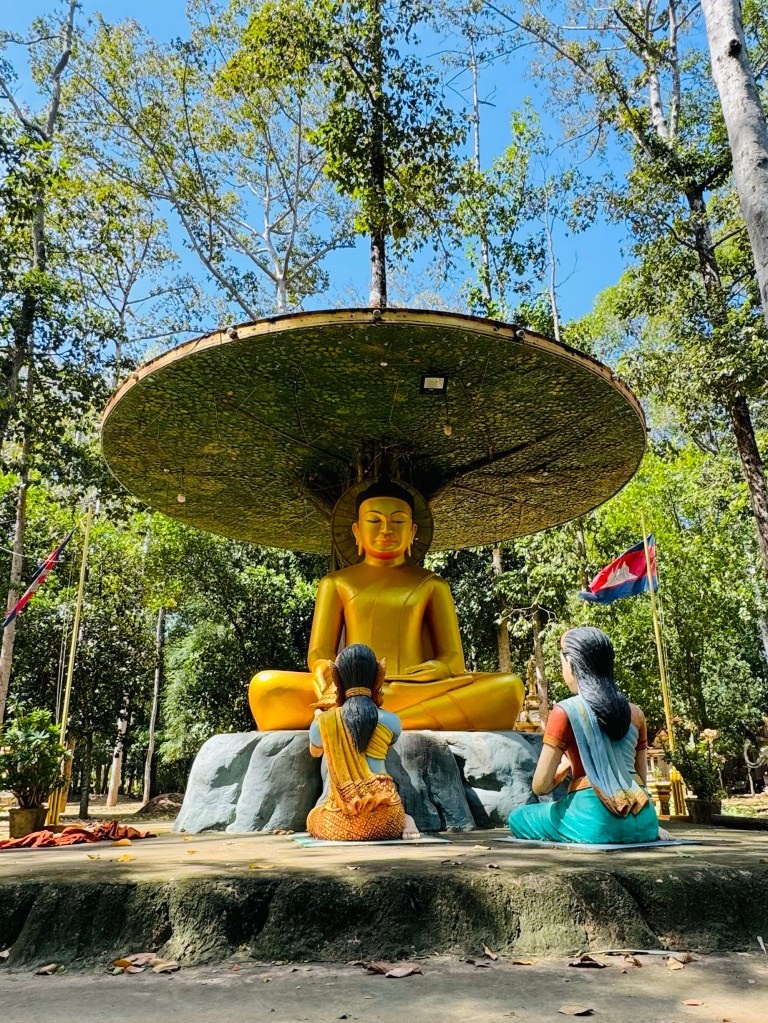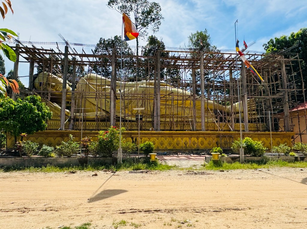 By this point I was genuinely in a lot of pain and really struggling, so were a couple of the others. We soldiered on but moods had dipped somewhat and the questions we were asking the guide had changed from in depth wonderings about Cambodia’s history to very much more along the lines of ‘are we nearly there yet?!’ We weren’t nearly there, we had to detour to see a giant sleeping Buddha – somewhat sadly it was covered in bamboo scaffolding on arrival – no one could work up much enthusiasm for it at that point!