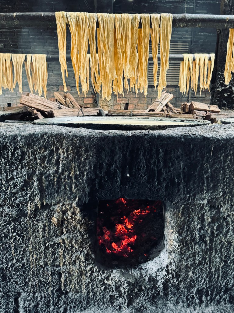 Next we stopped at a homestead that was making soy skin – this is where you boil soy milk until a skin forms on the top, then you skim the skin off and dry it. It’s used as an ingredient in a lot of Chinese cooking apparently. It was all very rustic, cauldrons over open fires and the guy was touching it with his hands way too much for my liking!