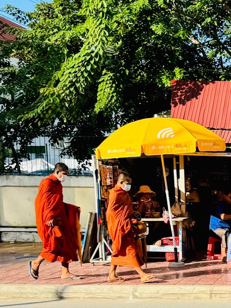 On the walk back to the hotel I saw monks out collecting food from the stall holders and distributing blessings. Interestingly, almost all the monks I’ve seen are carrying orange umbrellas. Now there’s no rain forecast for the next 10 days – do they know something we don’t (they do have a direct line to the one that controls the weather after all…) or are the umbrellas for something else? So many unanswered questions!