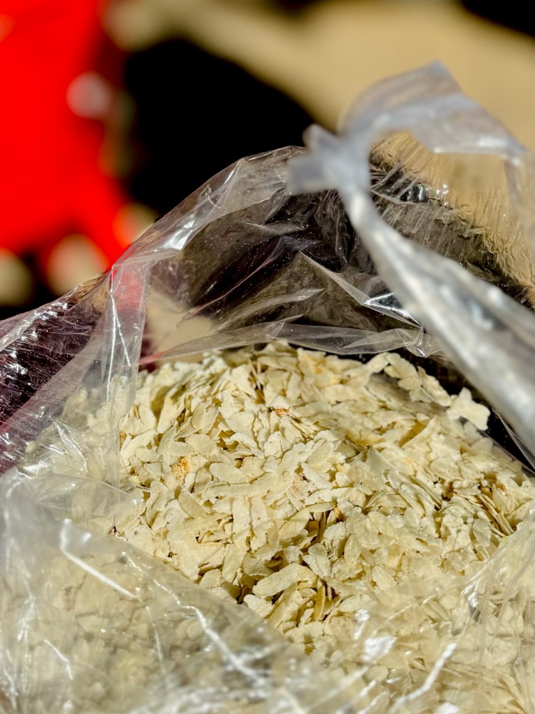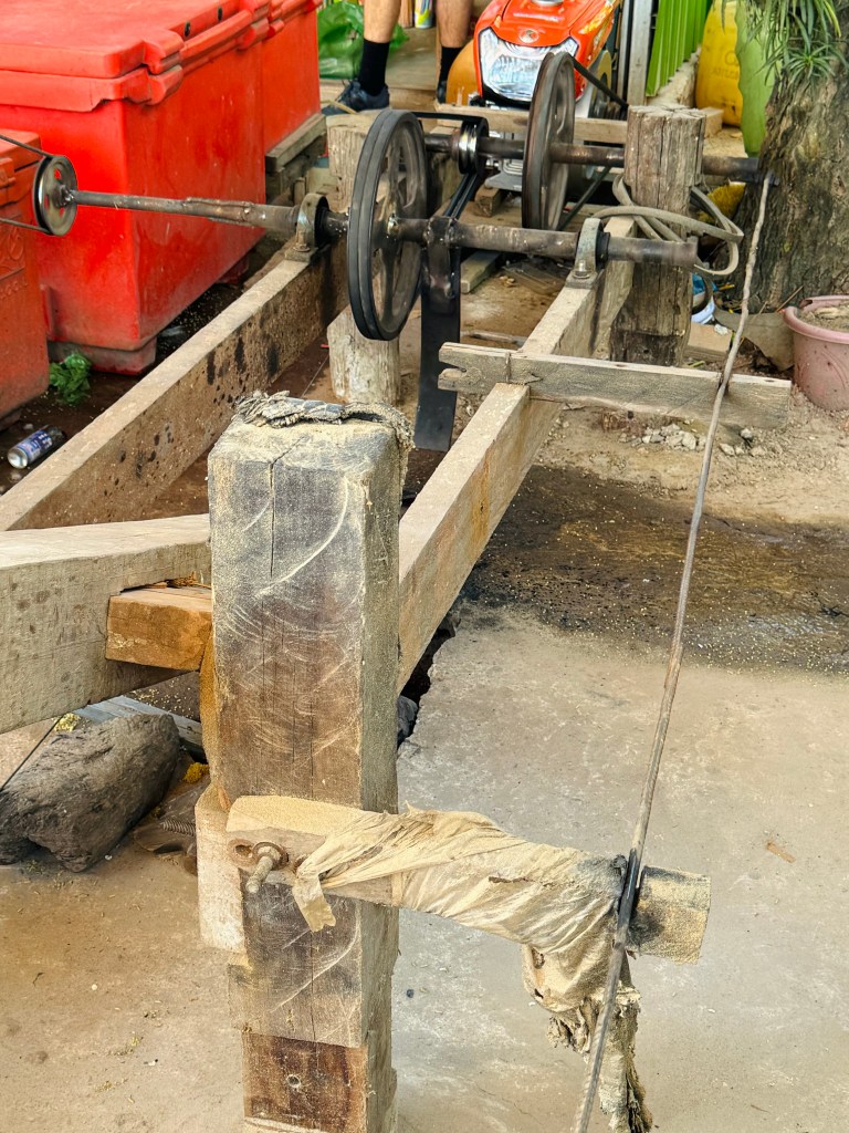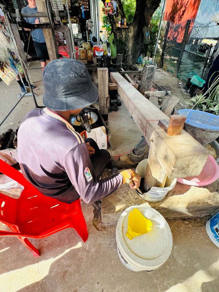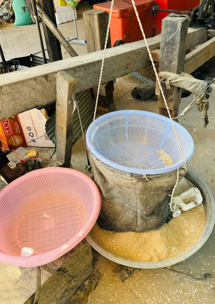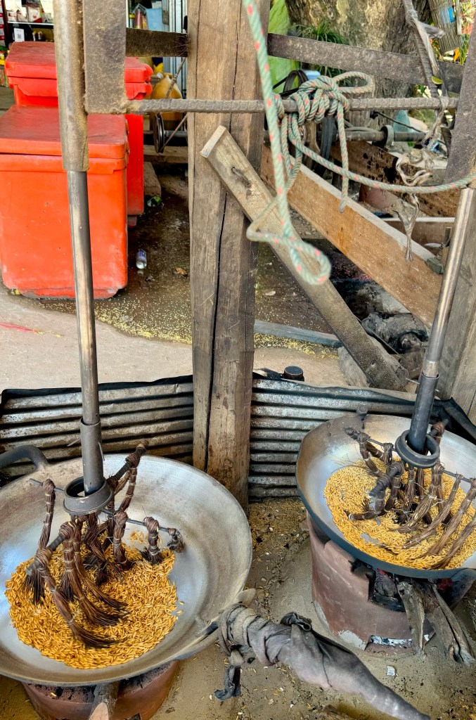 There was a motor at one end running three separate machines – one was rotating palm frond brushes to stir bowls of rice on top of charcoal fires until the grains popped. Then they were transferred to the bucket which sat under a huge log that the motor thudded up and down to flatten the grains. Thirdly the grains were put into a sieve which the motor vibrated to sift out any stones etc. It was so ingenious!