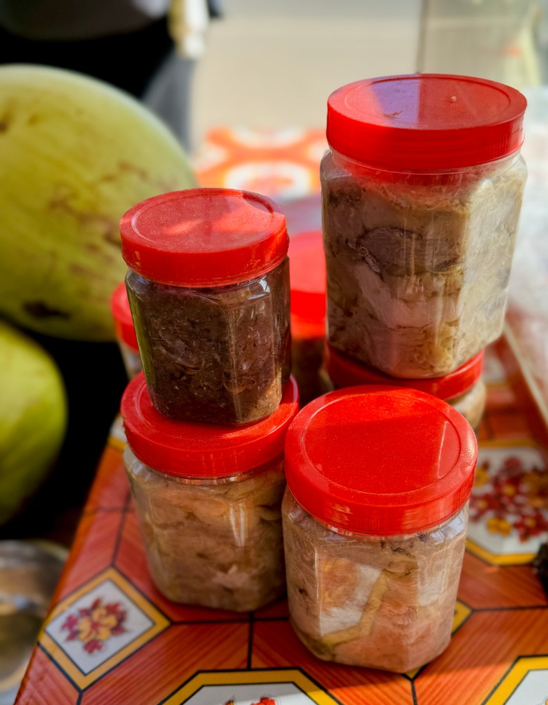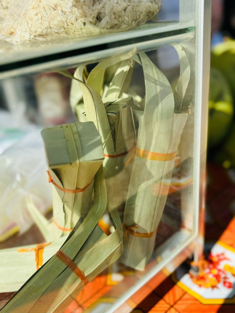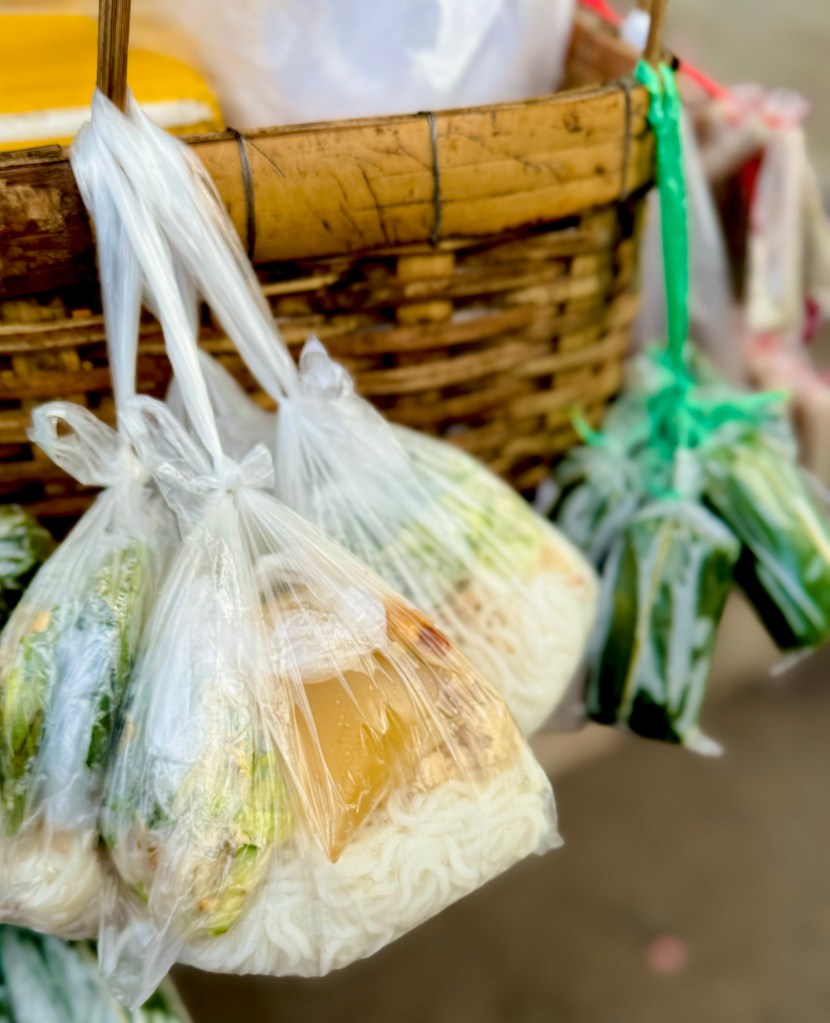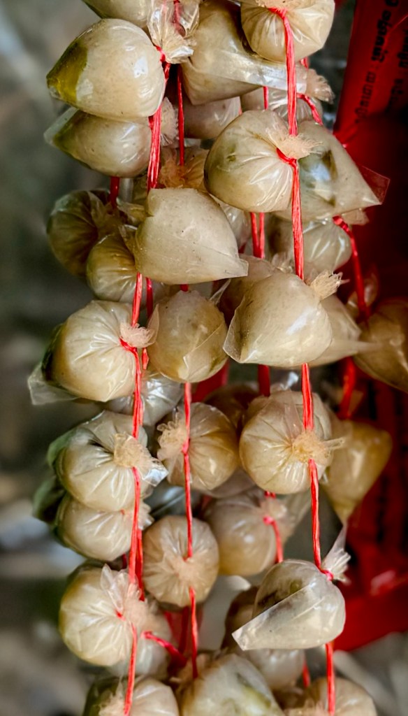 They were also selling some other snacks we hadn’t seen before – the tiny polystyrene pouches on red string are balls of raw sour fish – Kom advised that maybe our tummies wouldn’t like these so much 😬 same with the big tubs of assorted pickled fish…There were also round discs of palm sugar wrapped in palm fronds – these tasted just like condensed milk fudge but are apparently just pure palm sugar. It’s so fun trying everything!