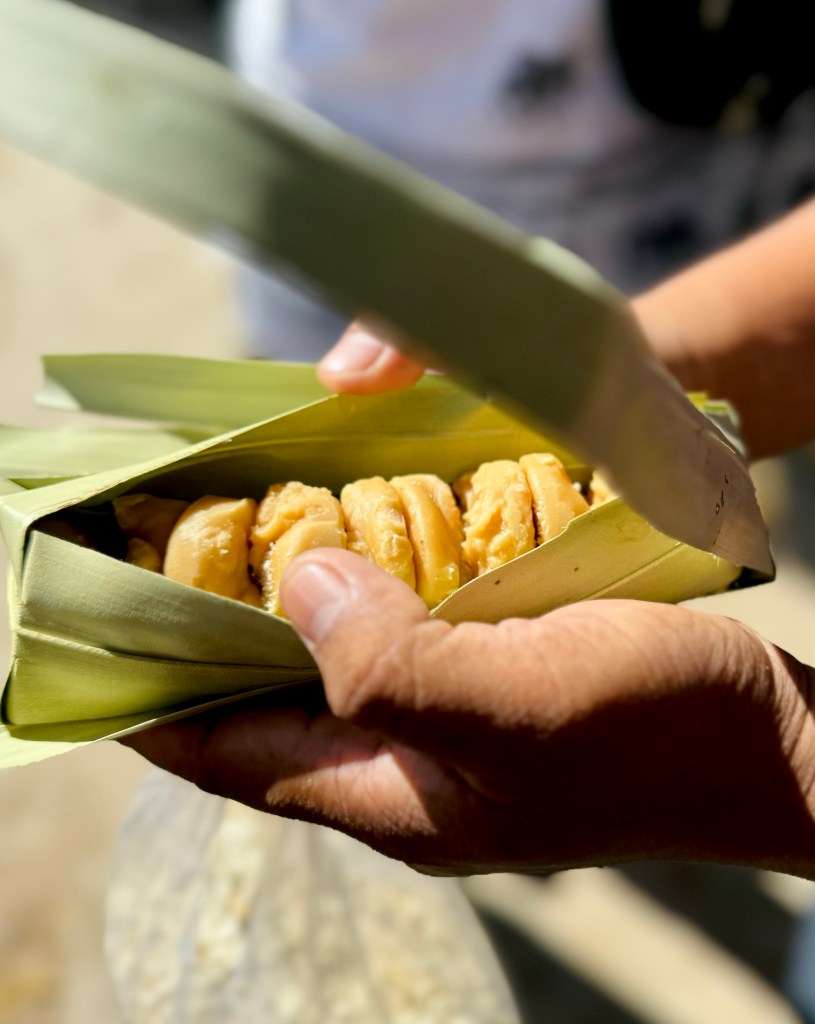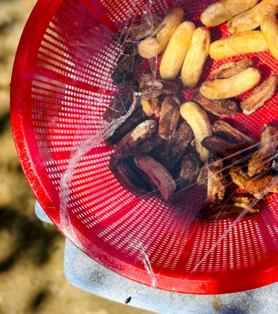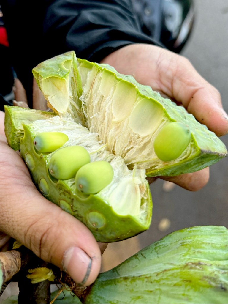 We had a quick rest stop at the most beautiful building, I think it must have been a wedding venue or conference centre, it was lovely. More snacks – here I bought slices of sour green mango that you dip in a mix of salt, sugar and chilli powder. I’d had this in Thailand years ago and loved it and it’s still so good – bright and refreshing. I also saw how yesterday’s caramelised banana snack is made – somehow I’d assumed it was more complicated than stick them in a bowl in the sunshine but evidently not!