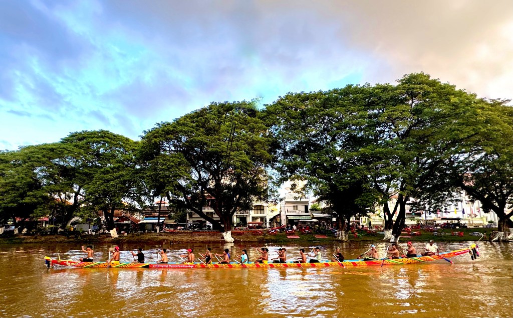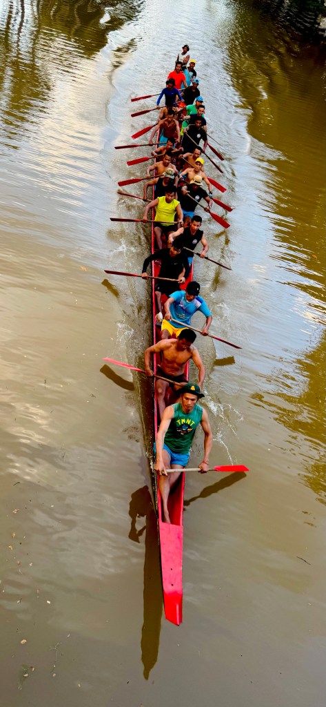 I carried on across the bridge, watching the stall holders setting up the night market. There were a few stalls open so I got a sugarcane juice (it’s monk approved now, even more important to get them in) and stumbled into what I think was a race or time trials of those long boats we saw in the sheds the other day!
