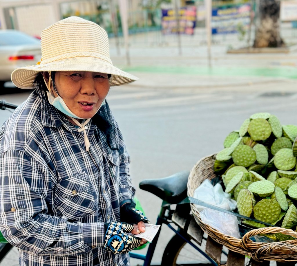 I passed a old lady on her bicycle with the front basket full of what I recognised as lotus seed pods – a young guy sitting on the bank flagged her over and bought a bunch of them – they were tied together in bunches of five like weird alien flowers. I asked the young guy what he wanted them – he spoke a little English and so showed me – they’re a snack! You break open the pod, inside are green seeds which you pop out and peel off the outer layer (like taking the skin off a broad bean) leaving a white bean that you eat raw, just as it is! I’d had lotus beans cooked in a dessert in Vietnam but I didn’t know you could eat them raw – every day’s a school day!
