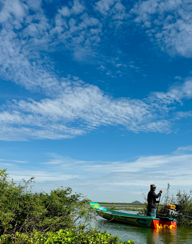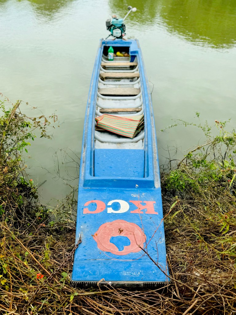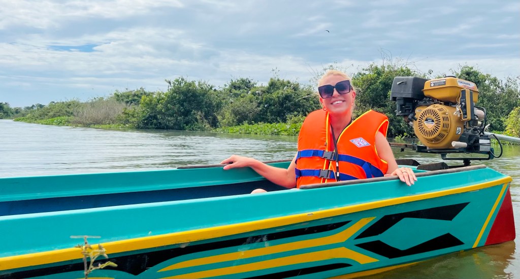 Yesterday Kom had asked if we fancied being the day one guinea pigs for a new activity that was launching and if successful, Intrepid might add to future schedules. It was a canoe ride through a bird sanctuary and as it was new and untested, it would only cost 3 USD each. Of course we all said yes (never say no to an adventure/bargain!) and we headed off there. Some slight teething problems when the boat eagerly sat waiting for us only seated 6 and there’s 12 of us – he pootled away to find a mate with another boat and arrived back around half an hour later – alone – but we were assured another boat would arrive imminently and so it did. Imminently-ish…On we all got with our brand spanking new life vests – look, they still had the hangars in them ( I actually think this might be what the 3 USD went towards, this was literally a brand new venture for them) And off we went.
