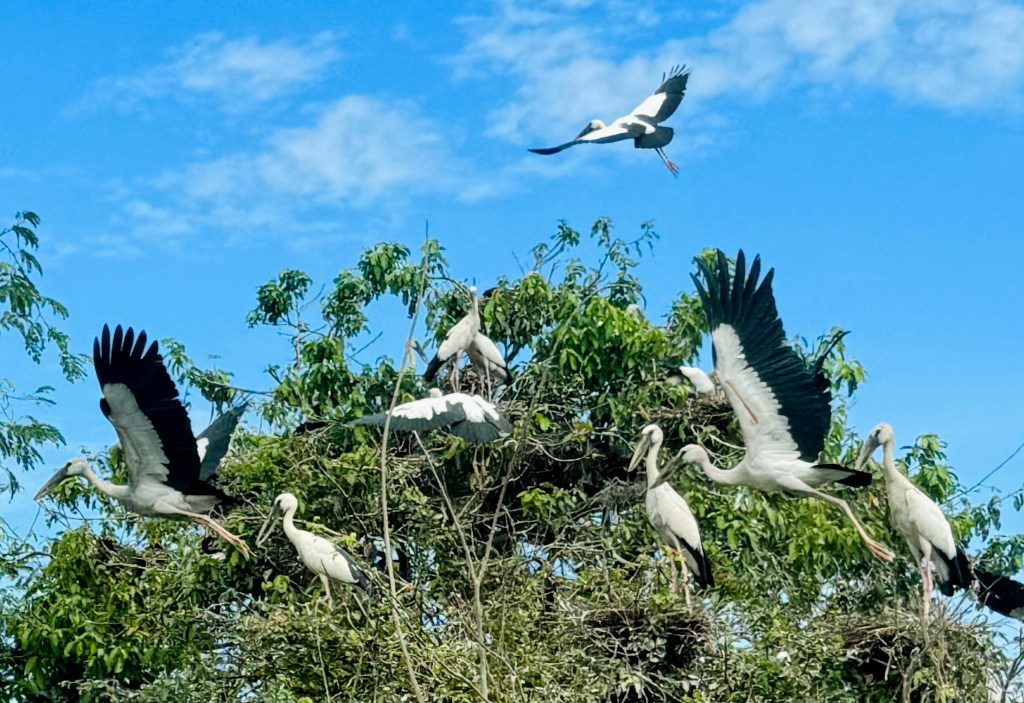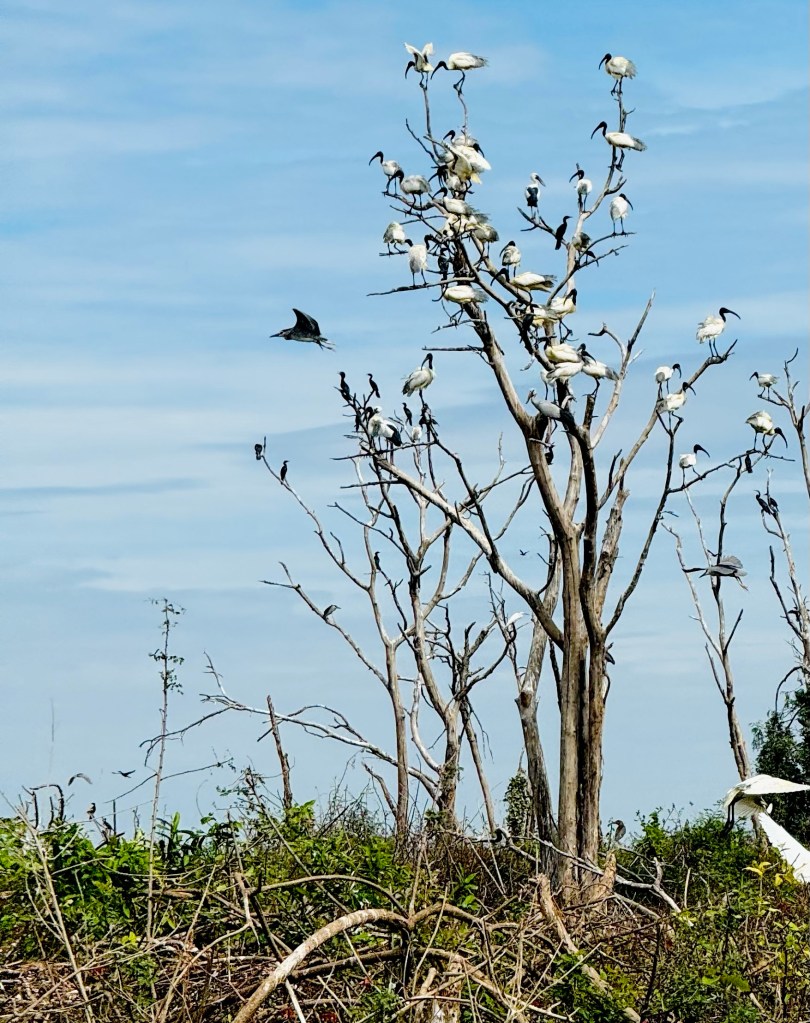 I’m running out of superlatives a bit for this trip but oh my, this was just amazing. Amazing. Thousands and thousands of birds nesting in the trees, swooping down in front of us, the sound of their calls completely filling the air while our brightly painted boats chugged down the river. Most of them were a species that looked like a small crane (dad, quite similar to the wallpaper you put up in my hallway cupboard – less pattern matching stress though 😂) – spindly long legs, huge, scalloped wings, white closest to the body and then edged in the deepest black.
