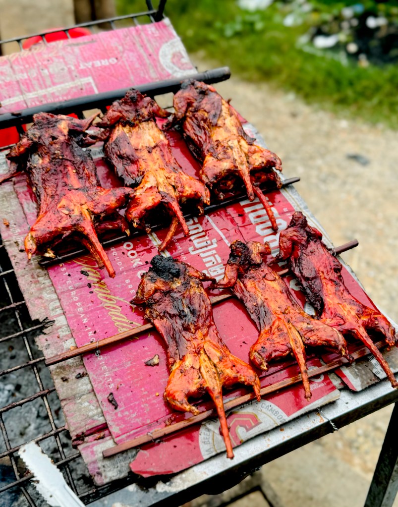 Along the way we saw some roadside sellers with the famous barbecued rats – we begged Kom to pull over and buy us one to try – he went one better and bought us a rat and a bottle of home tapped palm wine – brought to you in a reused plastic drinks bottle with pink lid! I can confirm that rat tastes pretty much like chicken/pork (maybe- I don’t really eat roast pork, I don’t know what it tastes like!) but very boney.