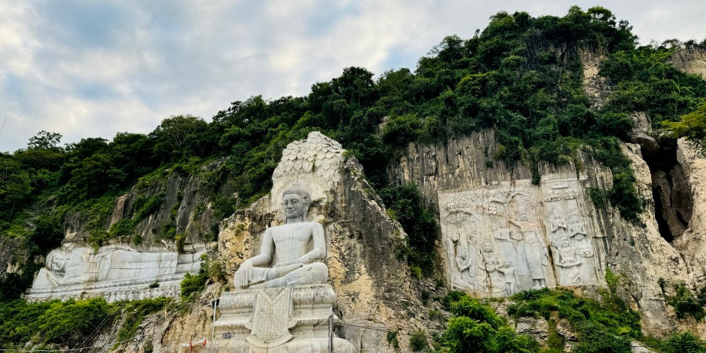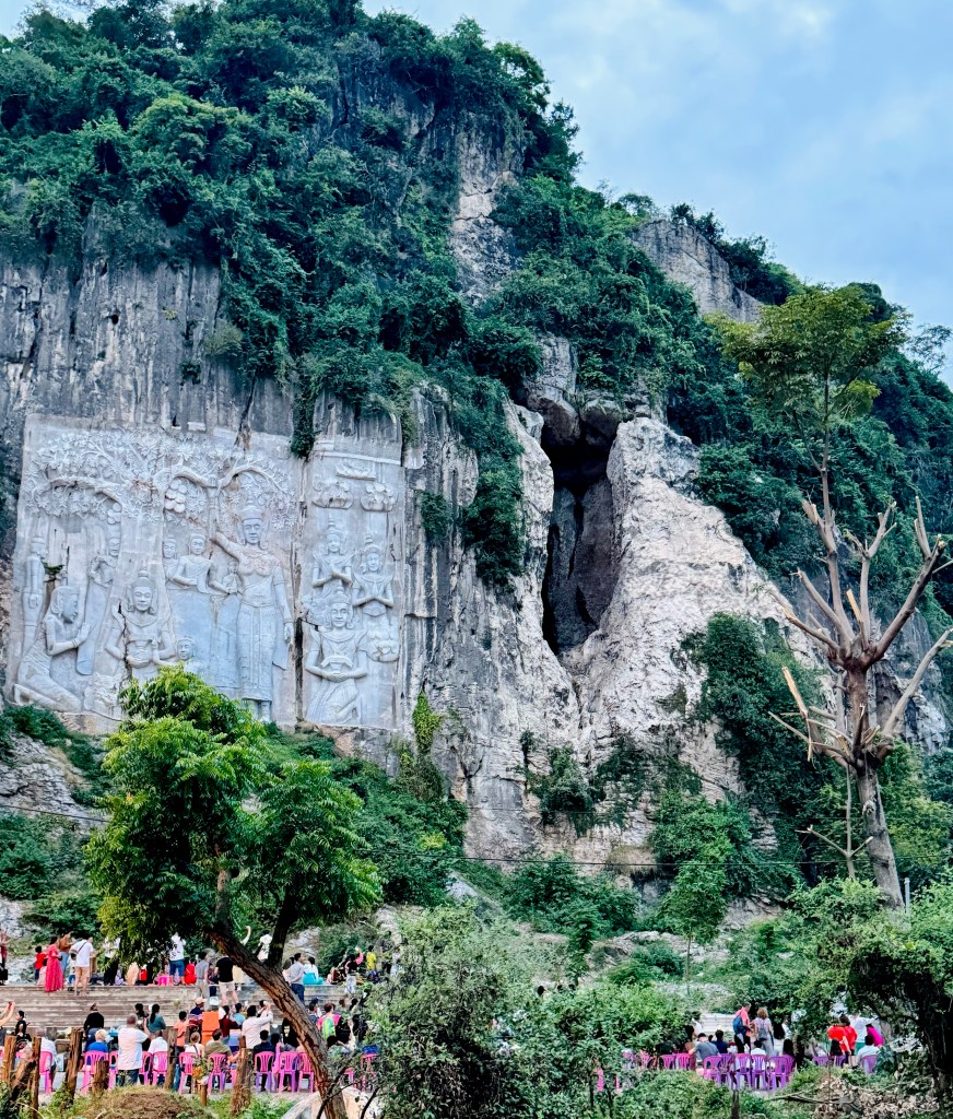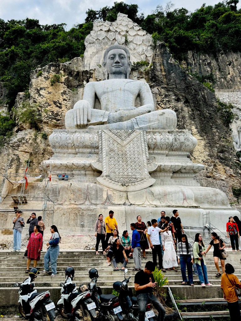 After this sobering visit we needed something to lighten the mood, so drove to see a natural phenomenon that the locals come out in droves to watch each night. There’s a hill with an enormous Buddha carved into the face of it and various other carvings and statues, next to which is a huge hole. Inside live approximately (I don’t know how they counted and came up with this figure) 1.5 million bats. Every evening at around sunset they fly out all together and it’s quite the local crowd puller.