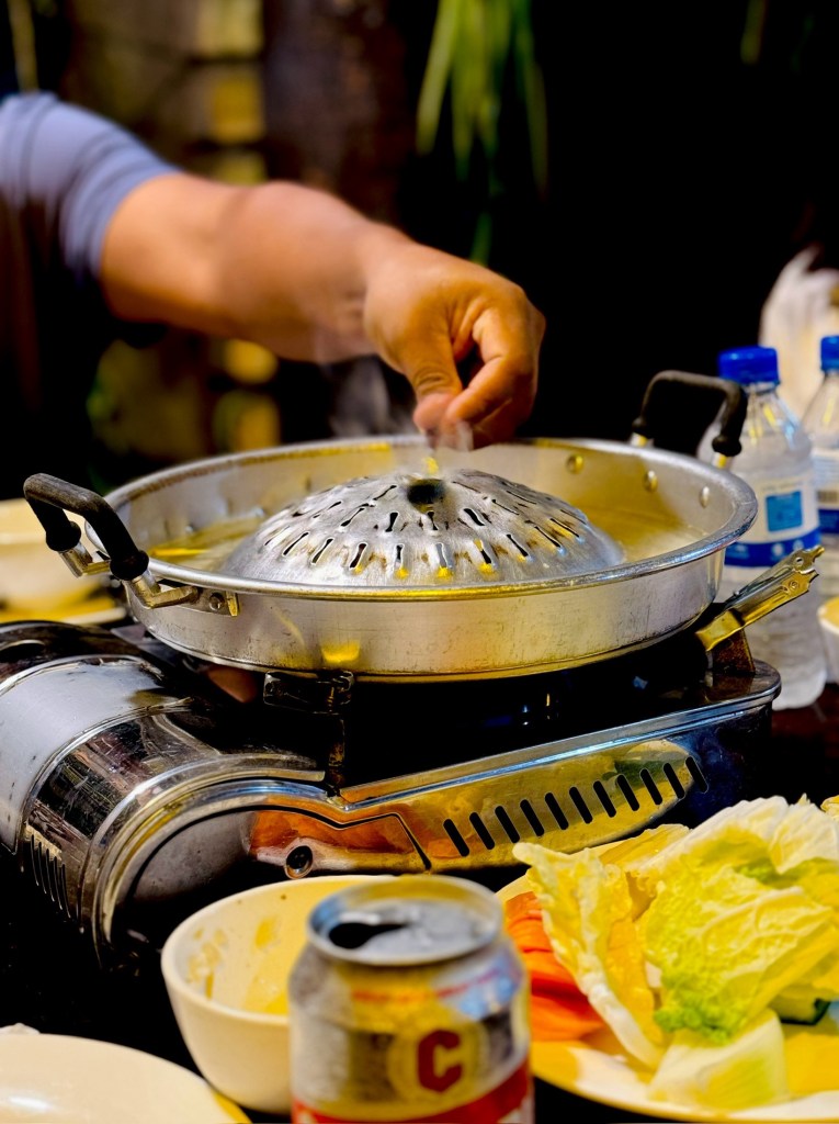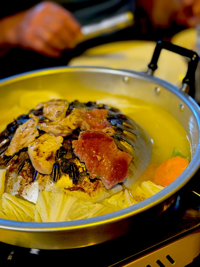 The main course was a hot pot – you have a mini gas burner in the middle of the table with the metal dish on top. Around the ‘moat’ at the edge is broth that you drop vegetables in to cook, then the middle is raised and you smear a little butter on (actually you’re supposed to use pork fat but apparently the westerners baulk at that so they’ve switched to butter for the lily livered white folks!) and then add small slices of meat to cook. When the meat is done to your satisfaction you drop it in your bowl with a few scoops of the broth and vegetables and voila, fresh meat soup! It’s a very clever way of making a small amount of meat go a long way so they can make more profit and it’s fun – for like the first three minutes. Then you just want to eat your dinner without the faffing about. But anyway, I’d filled up on aubergine and noodles so I just tried a piece each of the meats for research purposes – chicken – tender and delicious, beef – pretty good, if beef is your thing, pork – had to do a cough into a tissue to get rid 😂