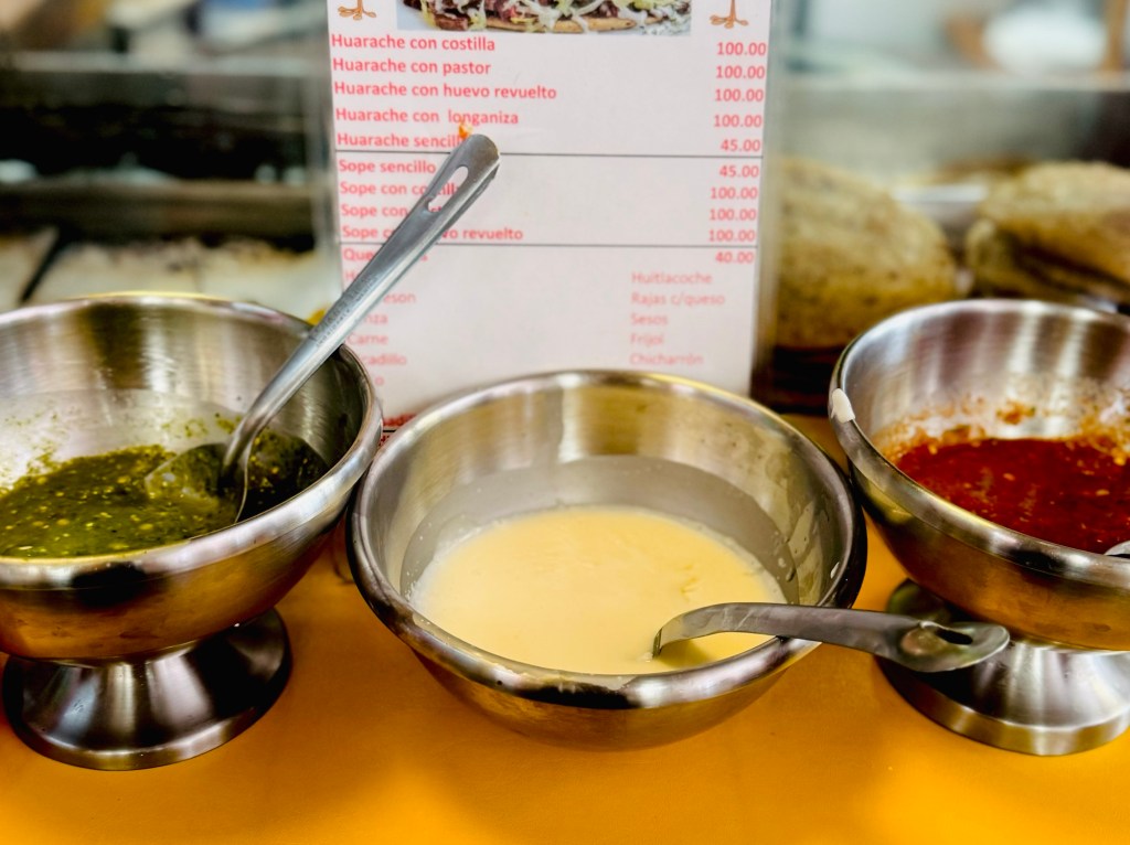 After another wander around we stopped at a food place – I don’t really know what to call it – it had about half a dozen different stands inside it but the front was open to the street – kind of like a mini food court being held out of a large garage! We tried tacos with huitlacoche which is a fungus which grows on ears of corn. That sounds gross until you remember mushrooms are a fungus and that’s exactly what it tasted like! We tried a spicy pork one too, both delicious and I braved the green sauce (the less spicy of red/green) – maybe next time I’ll go racy and go red. Maybe…