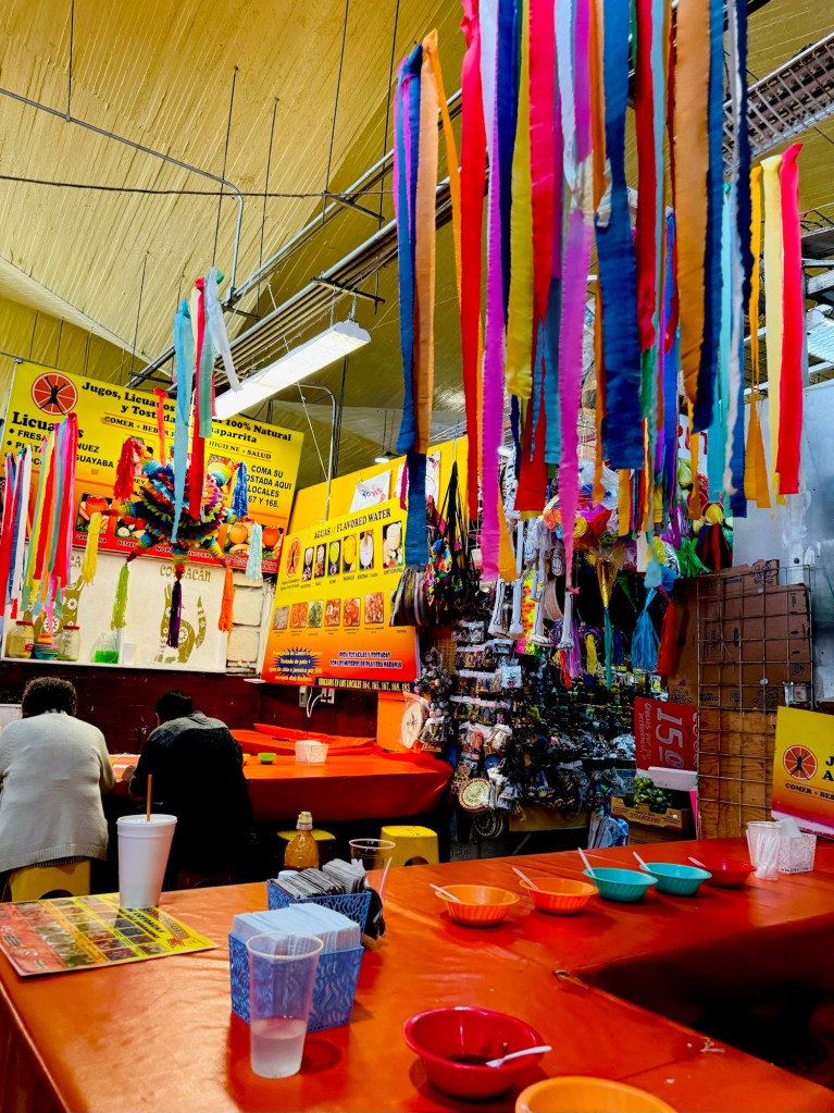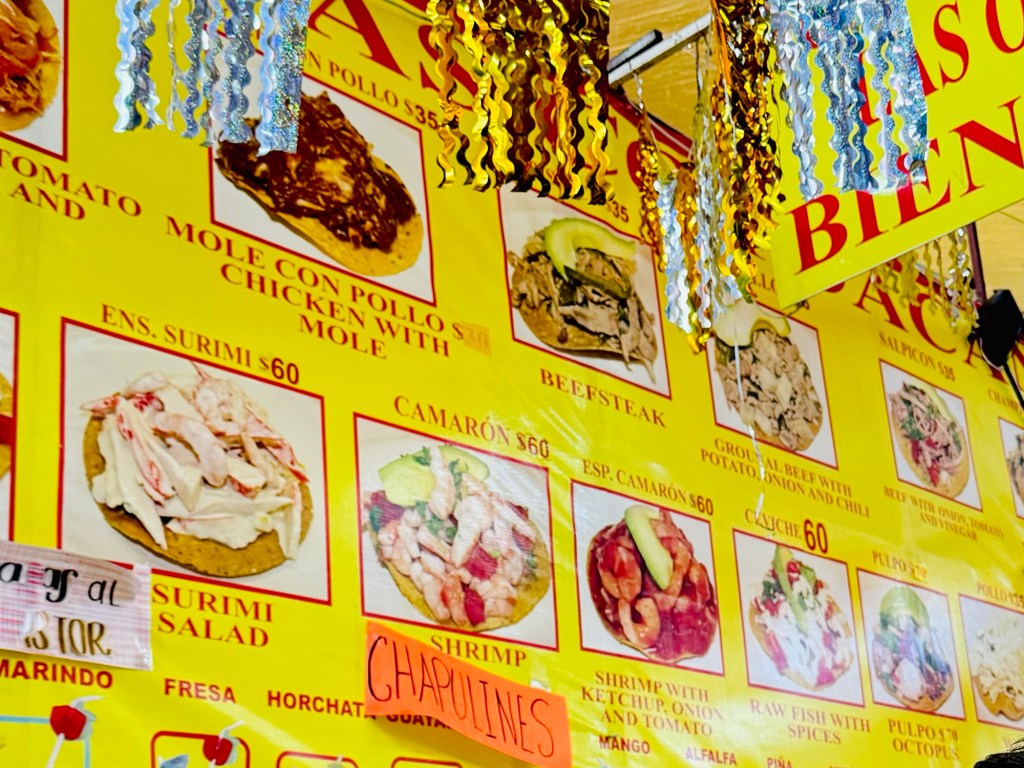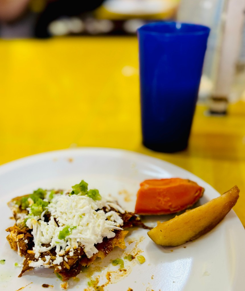 Last stop at an indoor market for a light lunch of a tostada (crispy tortilla with a cold topping) and an aguas which is a flavoured, sweetened water. I went for the chicken mole (pronounced mo-lay) which is a traditional Mexican sauce that has chocolate in, and a guanábana water. They were great and usefully, the exact food stand we went to I had marked on my map of places to visit having read someone’s blog post about it. So that’s one to check off the list without any effort whatsoever! We also tried 2 different fruits, neither one I could name if you put a gun to my head – one tasted like a rich, sweeter pear, the other was like a creamy, less perfumed papaya although it looked like a sweet potato!