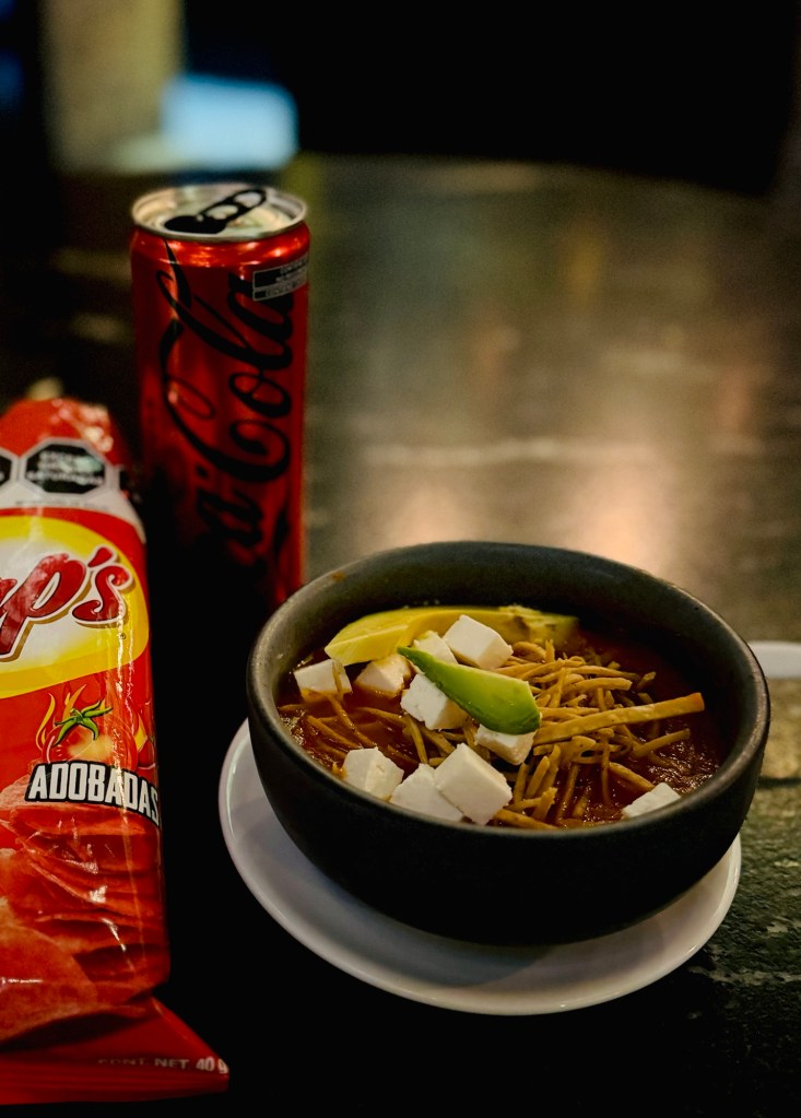 I had dinner at the hotel booked and made it all the way up to the balcony restaurant and had a drink at the bar – before looking at the wildly fancy and wildly expensive menu and realising I was both not fancy enough and very much unlikely to stay awake long enough to appreciate it! So made my way downstairs instead to the freebie cafe for sopa de tortilla (Mexican tomato soup), chilli crisps and a Coke. Then some strawberries and a mini muffin takeaway, currently being consumed in bed! All gratis and frankly, much more my speed than the posh fare upstairs 😂 You can take the girl out of Kent…!