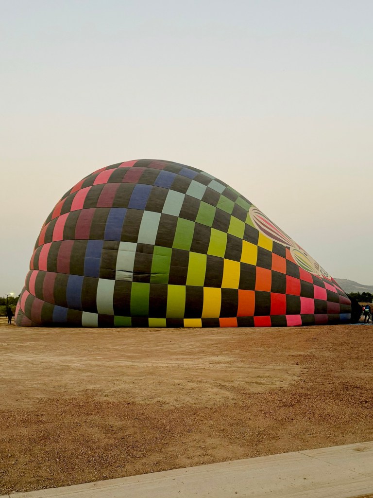 Then a quick video about the pyramids site using VR goggles which was a first for me. Super weird, I kept trying to lean my elbows on the table but I had no concept of where anything in real life was at all so kept slipping off 😂 Disconcertingly it had been dark when I put on the headset on and when I took it off it was daylight – I can see how you could lose entire chunks of time without realising with one of those. Back to reality and with elbows firmly back in place we watched them inflate the enormous balloons and gathered for the off.