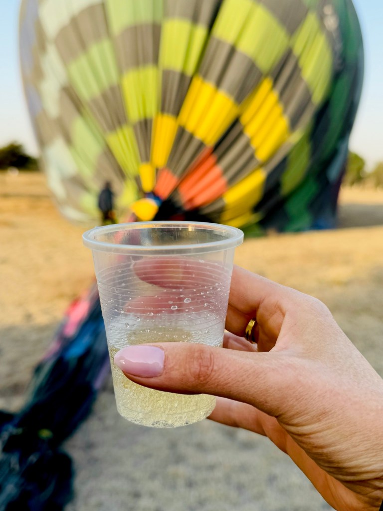 We celebrated our ‘safe’ landing with a plastic thimble of ‘champagne’ while the shamed pilot did some nifty parallel parking/flying of the basket up onto the trailer (that he could do…🙄) and headed back to base where we jumped in the car to take us back to the pyramids for our guided tour, safely on terra firma this time.