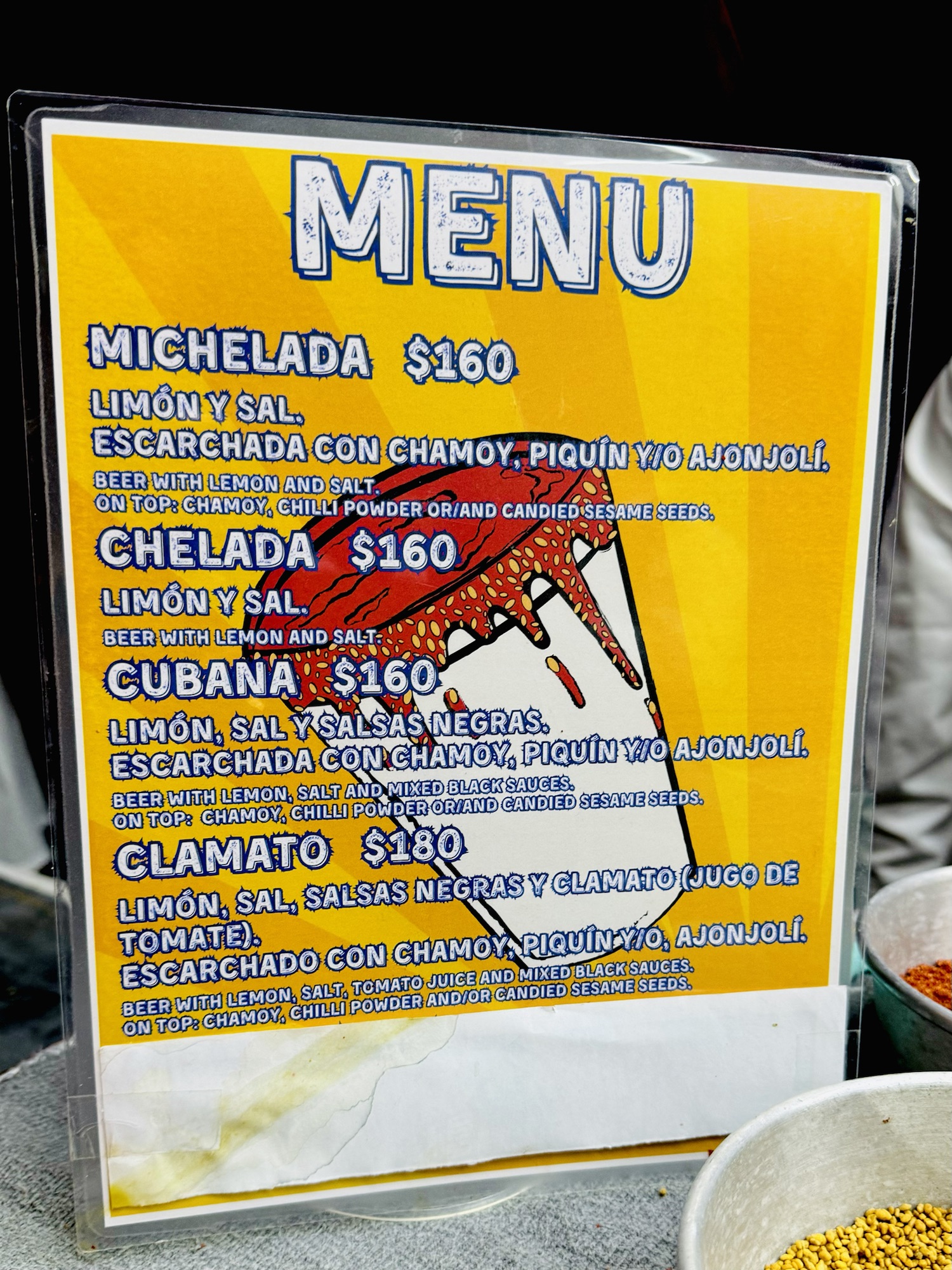 There were lots of stands selling drinks and we kept seeing people with big plastic cups of beer with the rim coated in something bright red. We stopped at a stall to try and work out what it was – a bunch of Mexican guys were there buying them and saw us looking. They told us they were micheladas – it’s a lager with salt and lime added to it and the rim is coated in chamoy which is a sweet and spicy fruit paste and candied sesame seeds.