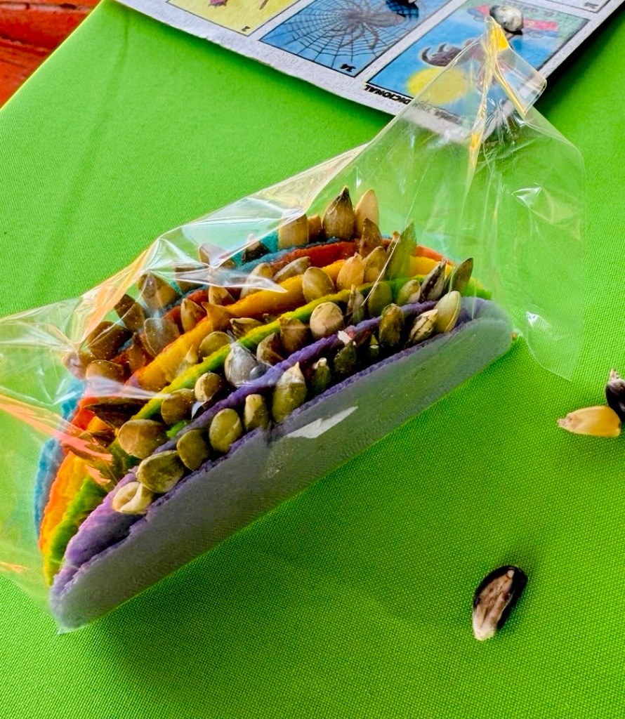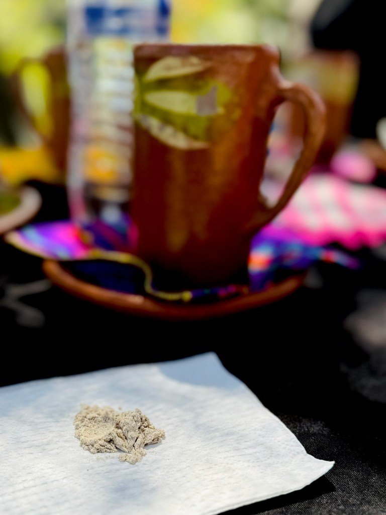 Next was a small version of the rugby ball shaped stuffed breads that I’d bought the group at the market a few days previously. These were definitely better but the texture is still not my favourite, they’re very dense. Then a salad with a sweet dressing which I skipped as it was 11am and I was basically on my third meal of the day. Lastly a pre Hispanic dessert that consisted of ground up dried corn, cinnamon and sugar. They dropped a spoonful of the greyish white powder onto a tissue and you just lick it. I’m not sure I’m supposed to accept white powder from stranger in Mexico…but actually it was very tasty and the only high I got was from the sugar!