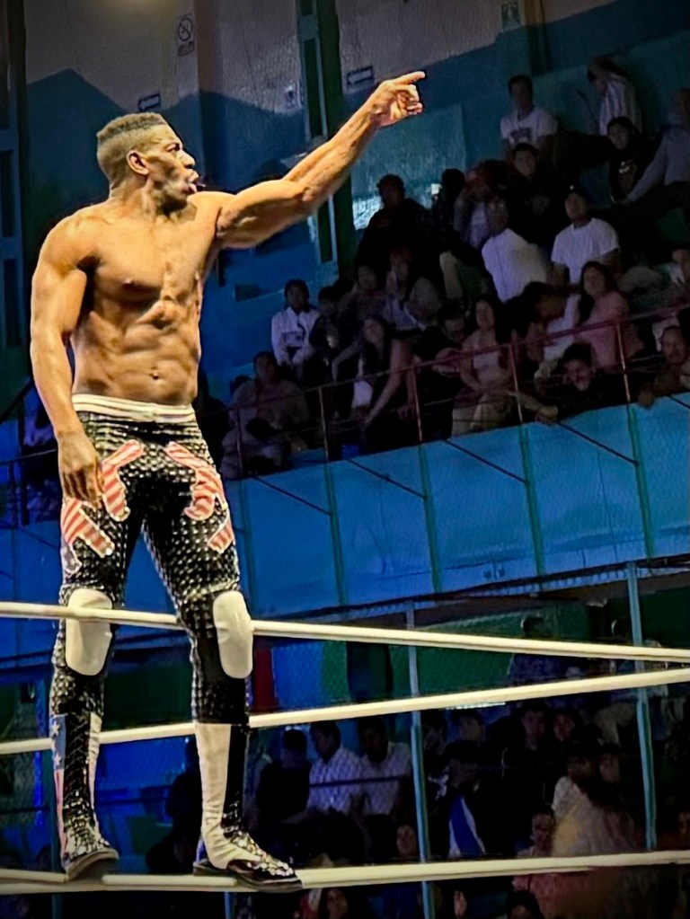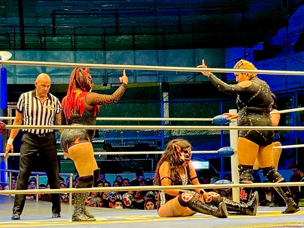 The costumes were a riot of spangles, including one match where the guys wore the very skimpiest of sparkly underpants – sadly it was the older and somewhat – chunkier – fighters that chose this apparel. You can’t knock their confidence I suppose. My favourite were the rodos team that strutted on in full suits and ties before stripping down to their glittery leggings. Each match has 3 rounds with a 30 second break in between to pull up socks, adjust crotch cups etc. This lot used the time to flirt with the girls in the crowd and even kiss and take selfies with the ones overcome enough to rush up to the ring!