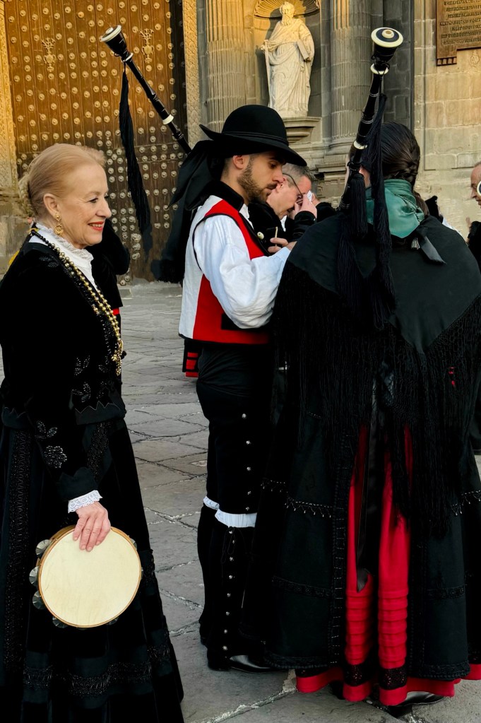 Walking past the cathedral we spotted a big group of people in some kind of traditional costumes, the women had on short lace veils and long velvet cloaks and the men had on long boots with ruffled white tops and hats with big bows at the back – and were toting bagpipes!