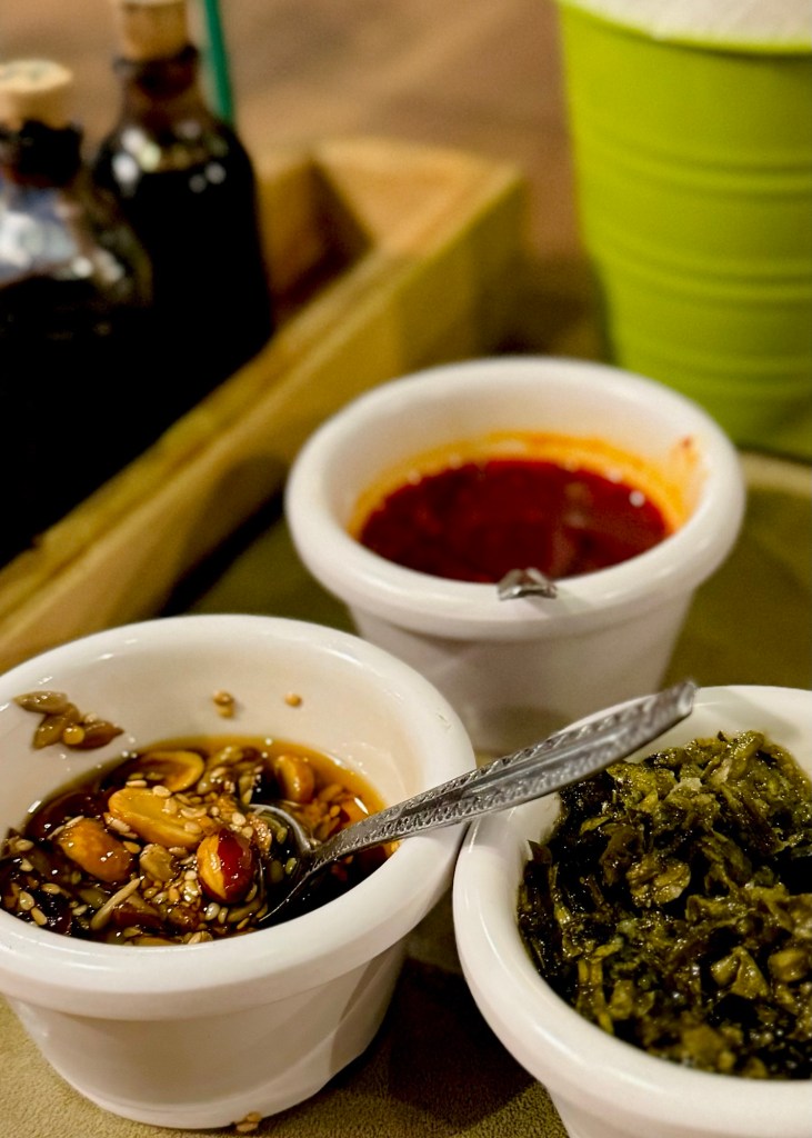We all four ordered pasta but the waiter returned to let us know there were only 3 portions left, so Lisa and I decided to share one and get a pizza too. We assumed this pasta to be homemade, hence running out – however. when it arrived it was most certainly out of a packet (there was a corner shop a few doors down, could someone have not popped out a grabbed a packet of spaghetti?!) and not only from a packet – from 3 packets…they had obviously used up the dregs of everything they had left but instead of giving each of us one type of pasta, they had mixed them all in so we all had spaghetti, penne and fusilli on the plate! Very odd but still tasty. Best thing was the sauces in the middle of the table – there was one with peanuts and sesame in garlic oil and another that I think was like a pesto with greens in it – all delicious and I’m pretty sure homemade.