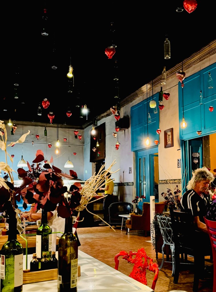 We struggled a bit to find a nice looking restaurant that also had decent veggie choices for Lynsey, so ended up at the Italian place they had been to the night before. It was so pretty, bright turquoise woodwork and hundreds of red baubles hanging from the ceiling, with Elvis crooning over the stereo – they do love a bit of Elvis over here apparently. Adding to the famous male singers in situ was Rod Stewart apparently – have a look at the photo below!