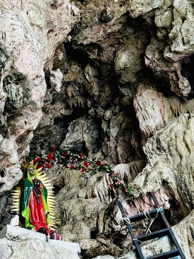 We passed by a stalactite that looks like a seahorse, a catholic altar set set up in a cave, accesible only by boat and wildly rickety looking ladder, a part of the wall nicknamed the Christmas tree for obvious reasons, see below, and some energetic souls who were kayaking. The kayaks looked like ants against the giant walls above them, it was quite surreal to see.