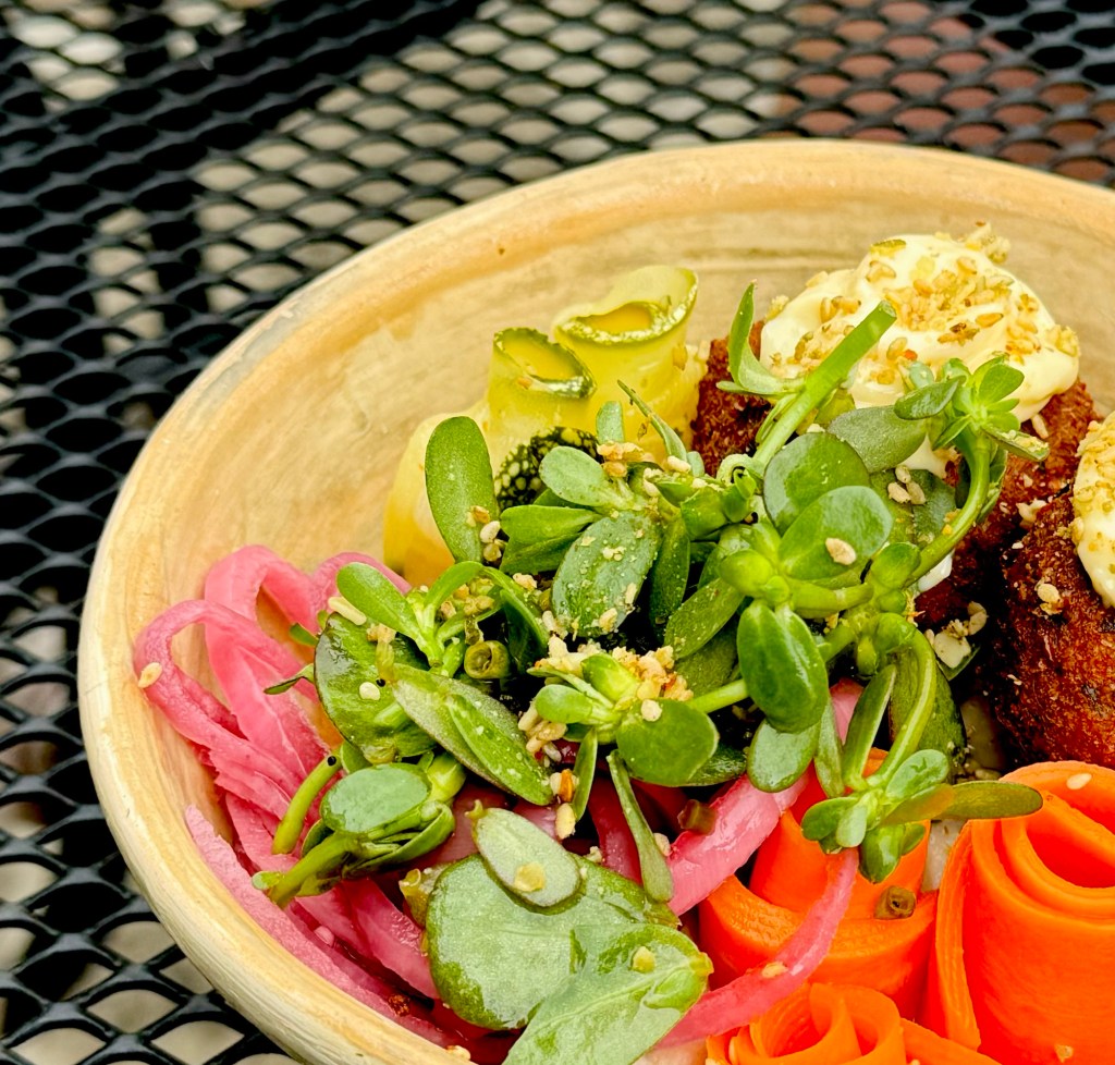 Back in town the weather took a turn and it got really chilly – I ended up in a long sleeve thermal top, hoodie, leggings and jacket and was still cold. We headed to a very zen vegetarian place attached to some kind of Buddhist centre for lunch and while the service was a bit slow and chaotic (highlights included me asking for my toast for the second time and being told the electricity would only currently work if she manually held the plug of the toaster into the socket – I told her non toasted bread would be just grand…and then me doing a spot of waitressing for them when they got a bit overwhelmed!) but the food was so pretty and delicious (white bean dip with ‘toast’, falafel and pickled vegetables)