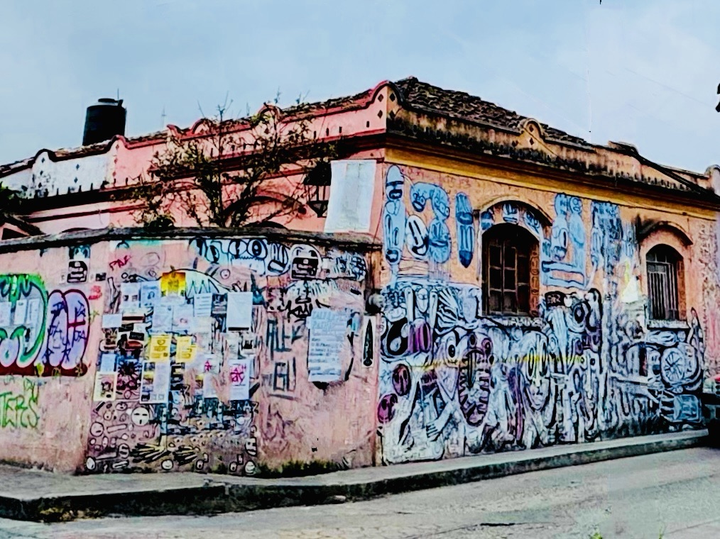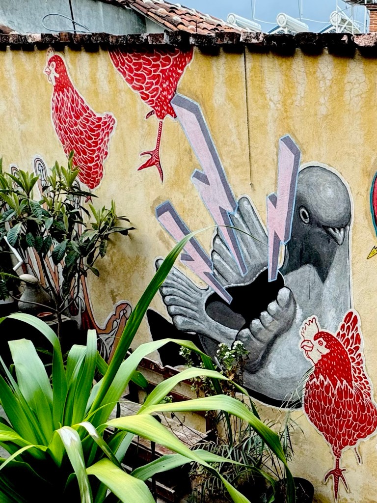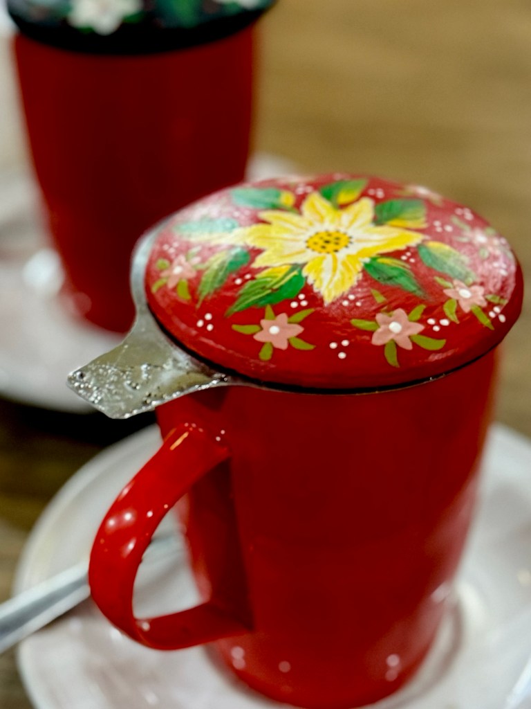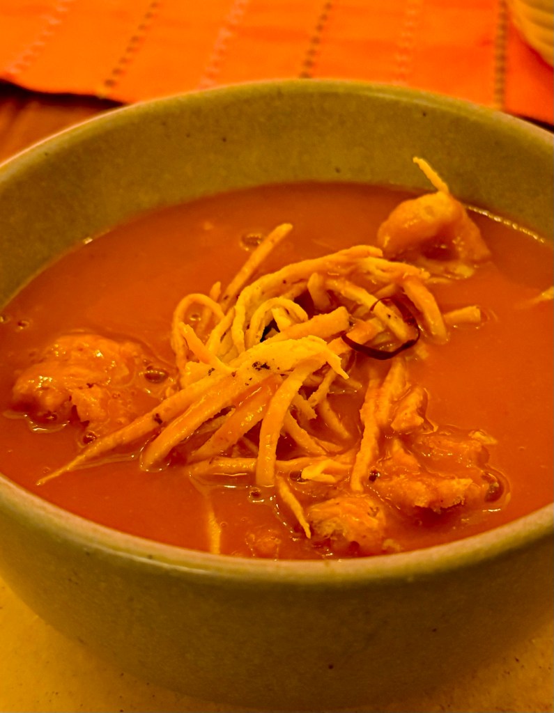 Getting too cold to wander much further, we huddled in a chocolate shop for a hot drink and then headed out for a light dinner of another bowl of sopa azteca, in a restaurant whose wall was totally covered in wide mouth clay toads – which is annoying as that was how I was going to redecorate next time and now it will just look like I’m copying them…The soup itself was really nice but the toppings were on the skimpy side as was the portion! Good job we’d had a late lunch and the Buddhists were much more generous with their helpings.